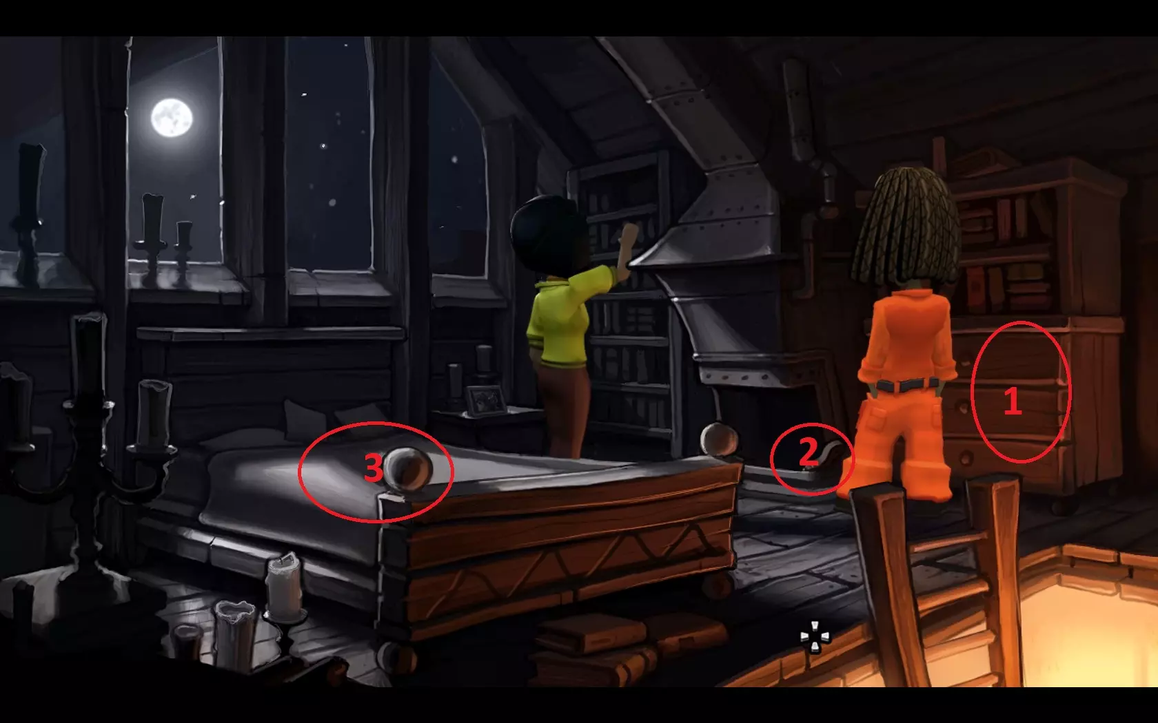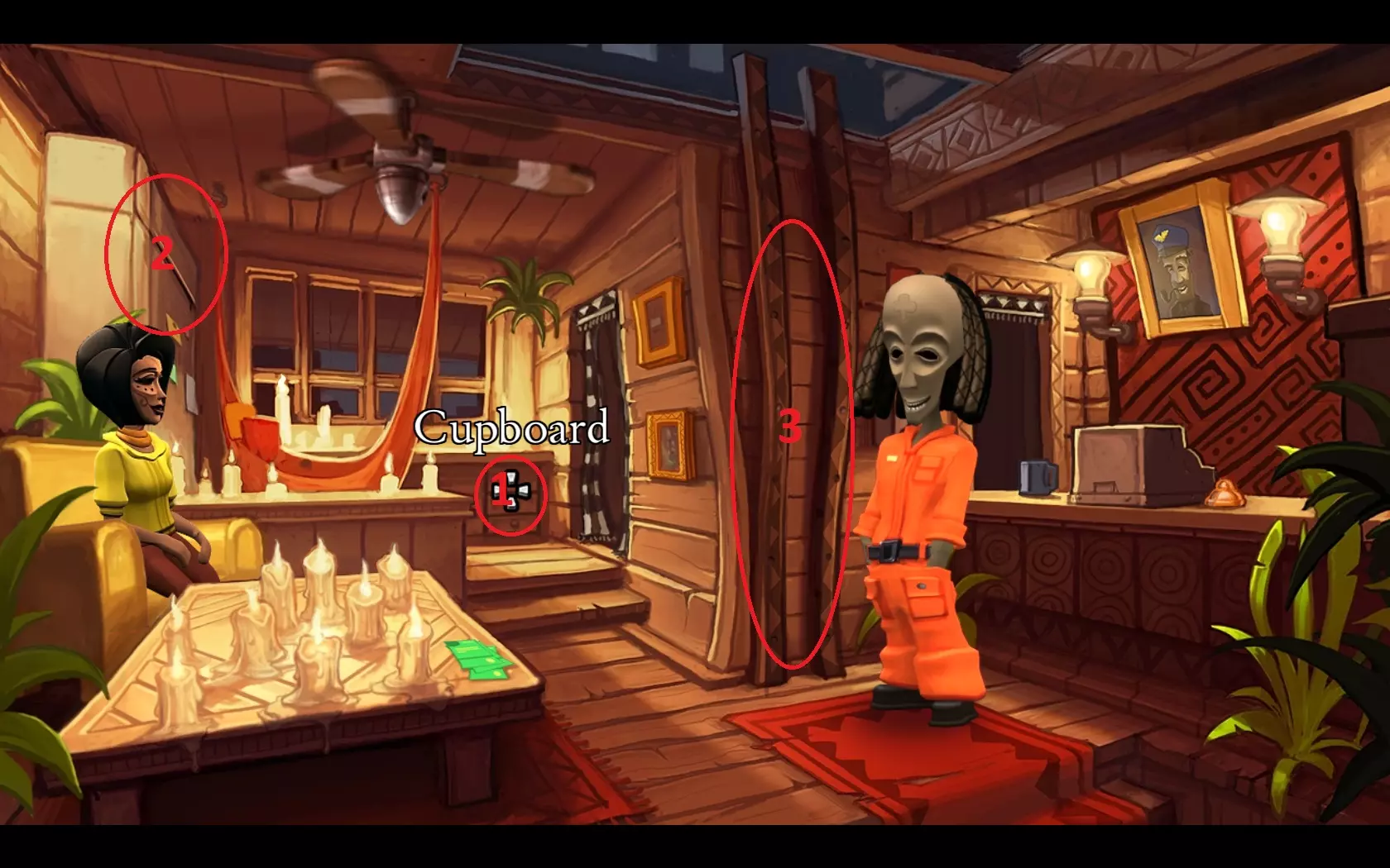 - 在莉娜(有钱的女人)的漫长过场动画结束后,靠近柜子(1)并找到面包棒。 - 然后靠近冰箱(2)并拿取奶酪。 - 将面包棒用在梯子(3)上,然后爬上去。