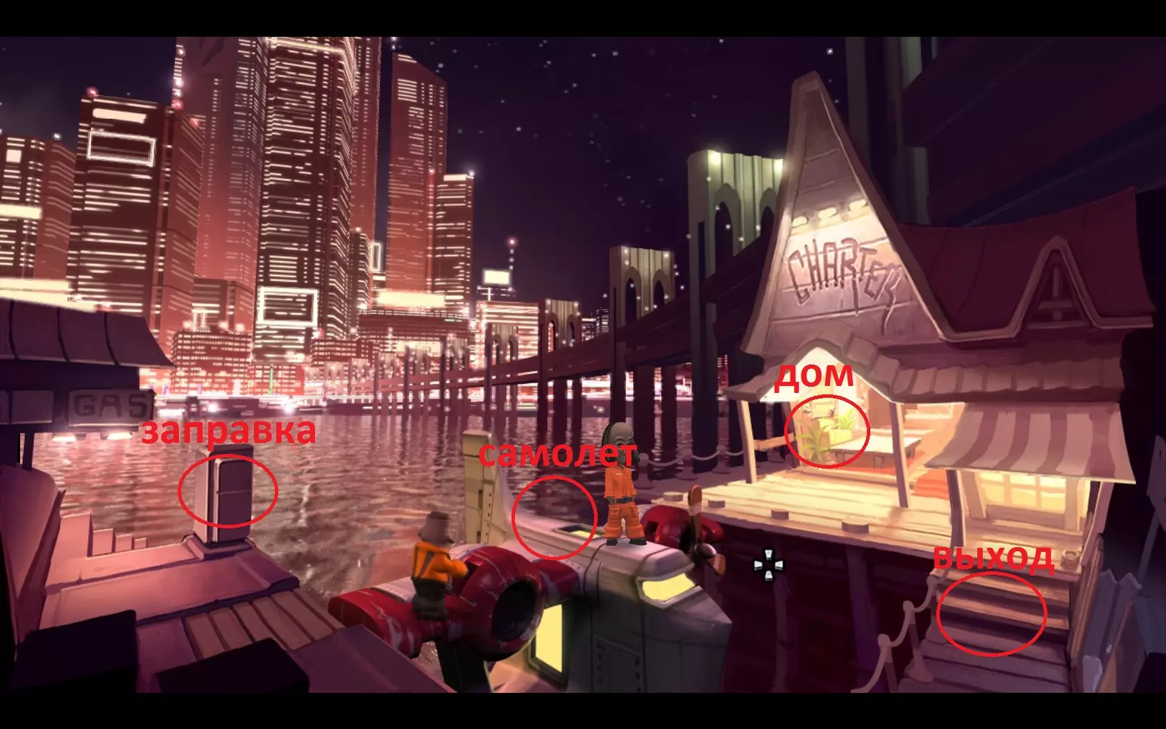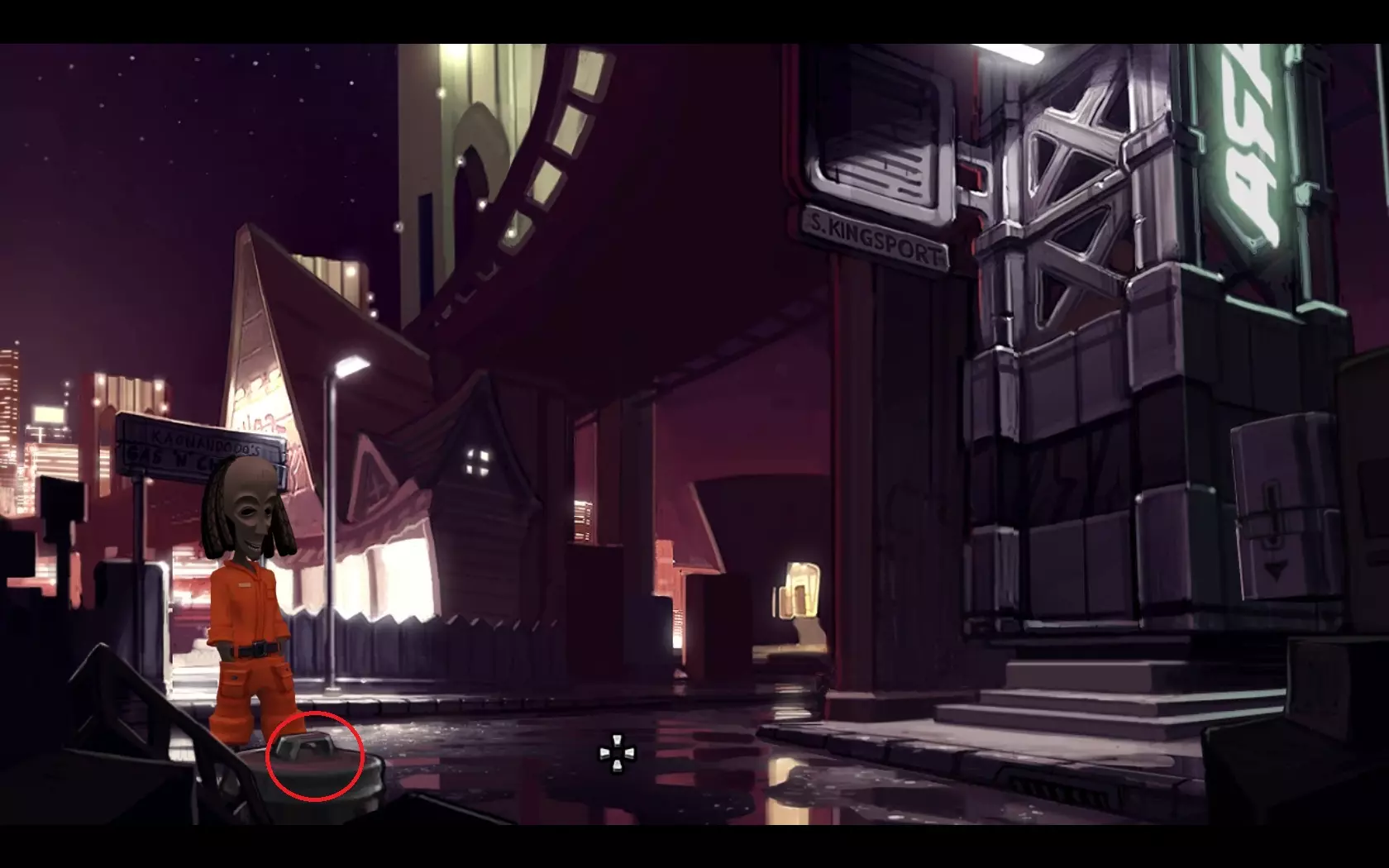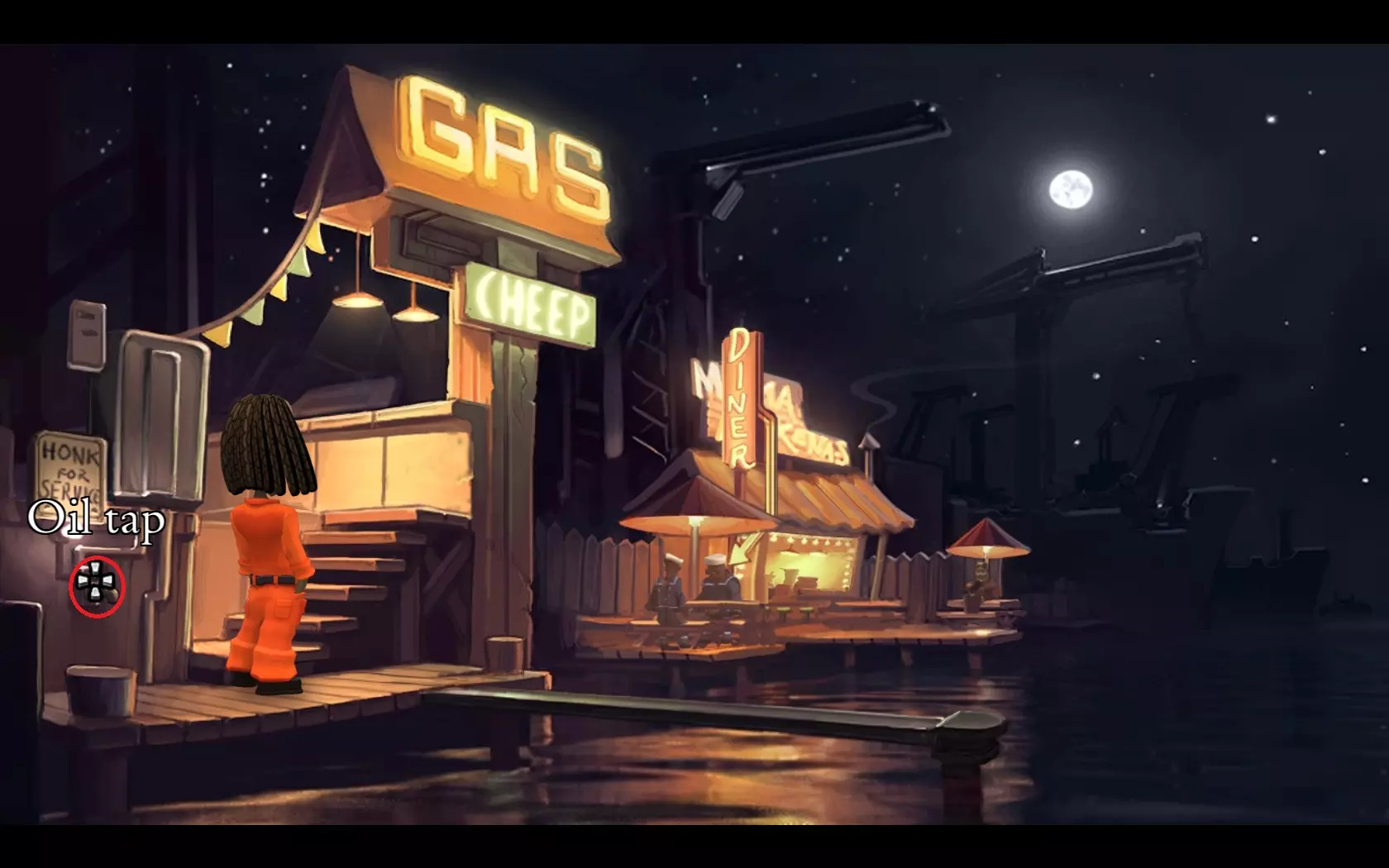 从游戏一开始,玩家就会接触到其操作机制,该机制相当简单,即使是新手也能轻松上手。而游戏的故事(尽管简单直白)却能将玩家吸引到游戏进程中,让人沉浸其中!不得不提的是,游戏中还有出色的音乐配乐。此外,游戏中的每个场景都制作精良,令人赏心悦目!游戏角色的配音非常出色,并且所有口音和语调都处理得恰到好处,仅凭声音就能想象出出现在我们面前的是怎样的人物! 再来谈谈音乐:采用了爵士乐和雷鬼乐的优秀传统创作而成。音乐作者是西蒙·德索萨(Simon D'souza),他是英国非常著名的萨克斯管演奏家。 02. 剧情 故事发生在海滨城市圣阿曼多,这座城市距离神秘的“边缘”地区不远。两名黑帮分子闯入大学教授的办公室,却发现教授并不在那里。最终,线索指向了金斯波特湾城郊的一家偏僻特许代理机构兼加油站。这家机构由布万和基托兄弟经营,自从他们的养父卡农多多多年前神秘失踪后,便一直由他们掌管。一位名叫莉娜的年轻女子找到了他们,她正在寻找一本失传的书,书中记载着进入低地的禁忌秘密。巧合的是,这本书在卡农多多的旧物中被发现。莉娜雇佣兄弟俩将书送到低地。喜欢莉娜的布瓦纳同意了,但兄弟俩的水上飞机早已无法飞行。基托什么都能修,但为此布瓦纳必须找到必要的零件。 03. 流程攻略 接下来在本攻略中,我会详细描述游戏的完整流程,而且会尽可能详尽。所有细节都在截图上标明。 为了让大家都能明白,游戏的主要角色如下: 布瓦纳——一个风趣的拉斯特法里派教徒,想要帮助琳以赢得她的芳心。由他的养父卡农多多教授了飞行技术。是游戏角色。基托是布瓦尼的兄弟。他是个天生的机械师,什么东西都能修好。 莉娜是一位年轻女子,正在寻找神秘的山谷。 卡农多多是布瓦尼和基托的养父,是一名飞行员。多年前在离奇的情况下失踪了。 巴洛是阿尔图港腐败的警察局长。在被金钱和权力腐蚀之前,他是卡农多多的老朋友。 老板是阿曼多电力公司的总经理。是游戏中的反派。 04. 遇见莉娜 进入后,主角们在自己的加油站,旁边是因未缴费而关闭的电箱。 - 帮助基托打开电箱外壳