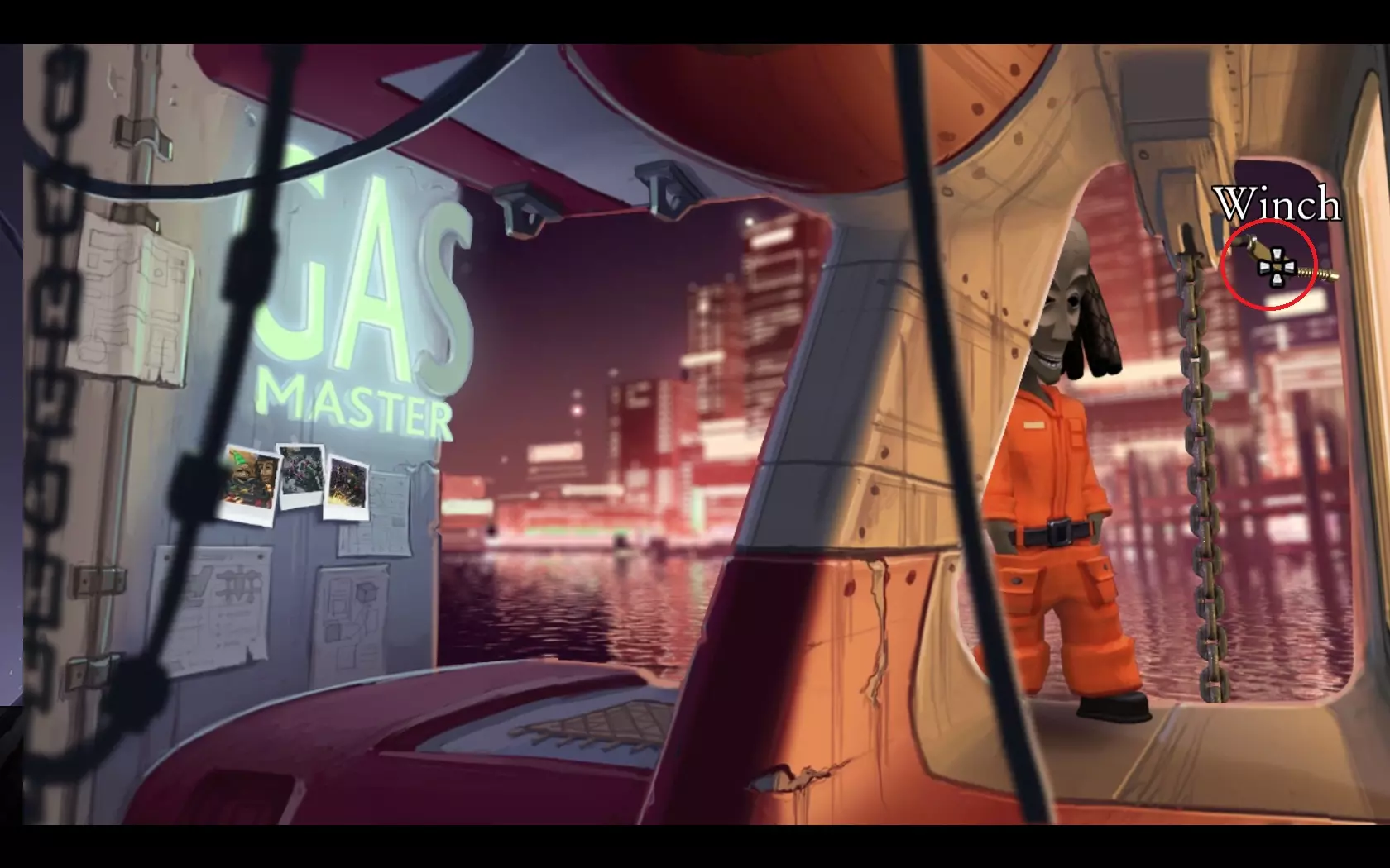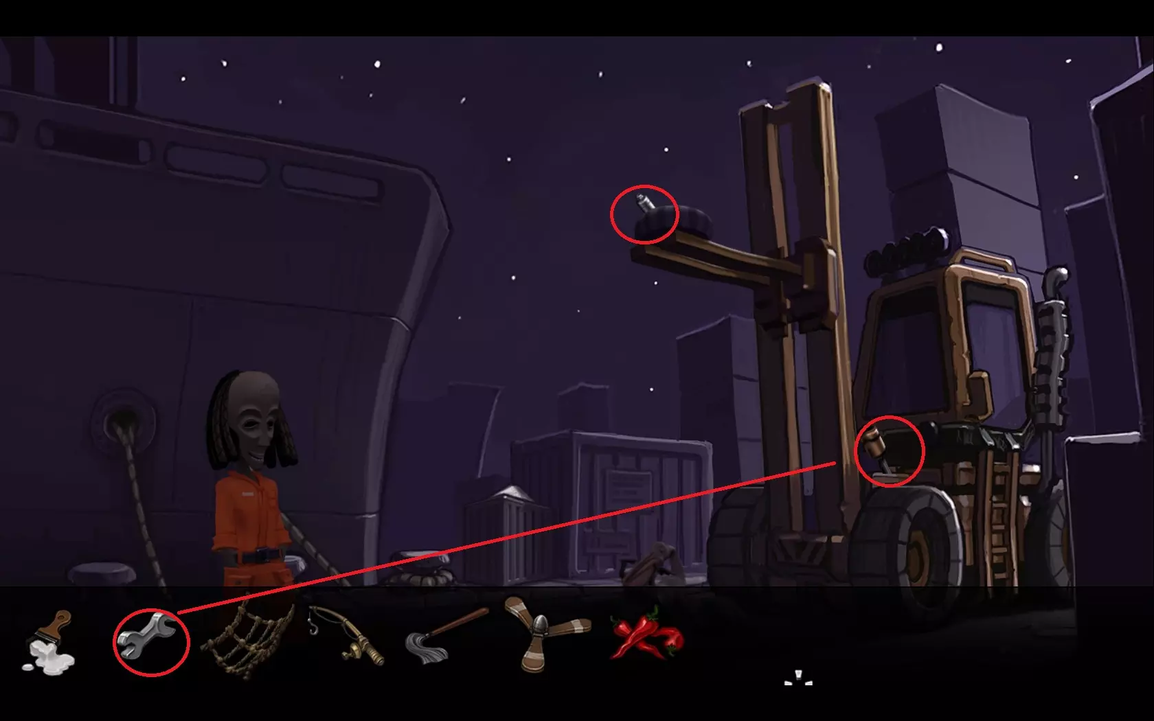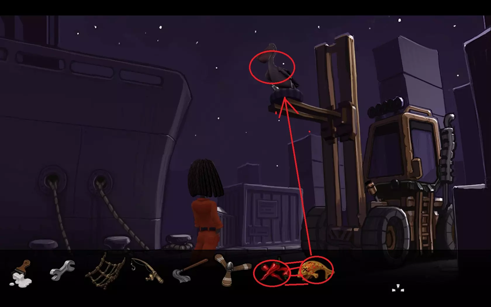 - 再次回到船上,但继续向右穿过它。 - 在物品栏中将脏鱼与辣椒组合,然后喂给鹈鹕。 - 当鹈鹕倒下后,用扳手操作起重机的操纵杆。 - 起重机会降下,检查鸟巢并获取金属杆。
