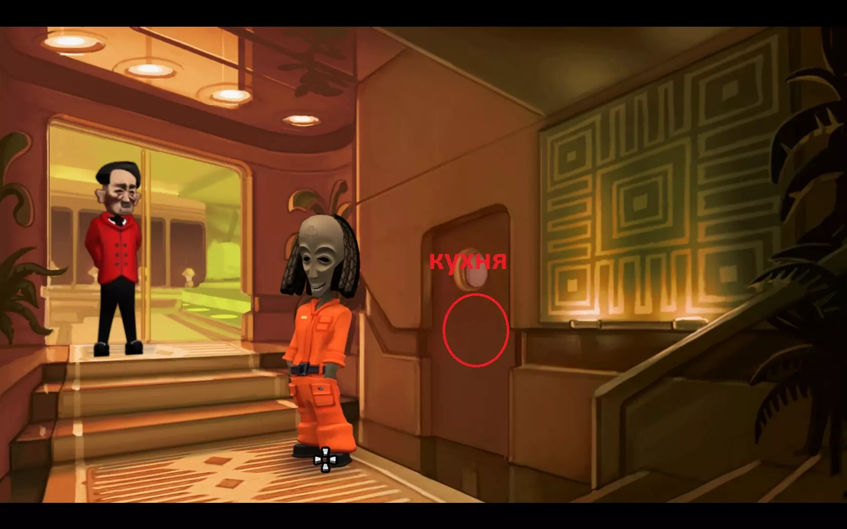 - 拿起盛有开胃小菜的托盘。 - 离开小屋,尝试进入玻璃门。 - 向门房出示开胃小菜。 - 穿白夹克的饥饿男人会吃掉你所有的开胃小菜。 - 返回厨房,再拿一个托盘。 - 离开厨房后,不要急于从门房那里经过。 - 用白色颜料给开胃小菜上色,穿白夹克的男人就不会吃它们了。 - 穿过右边的门。