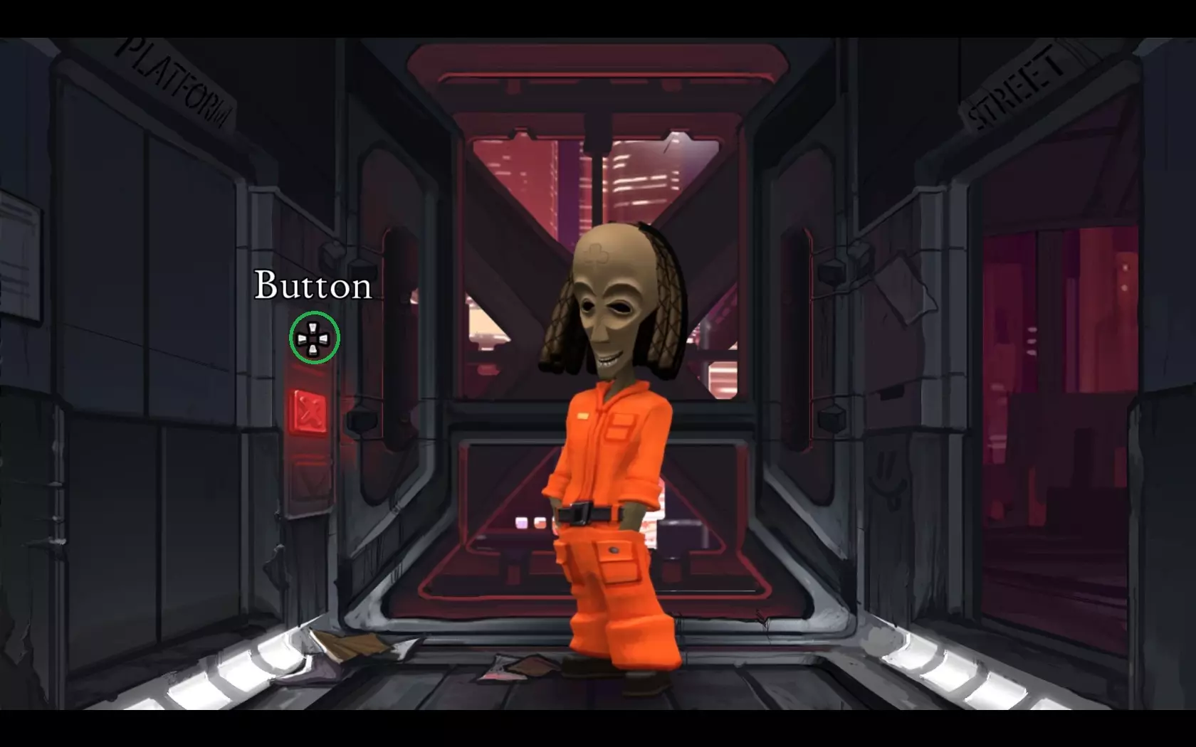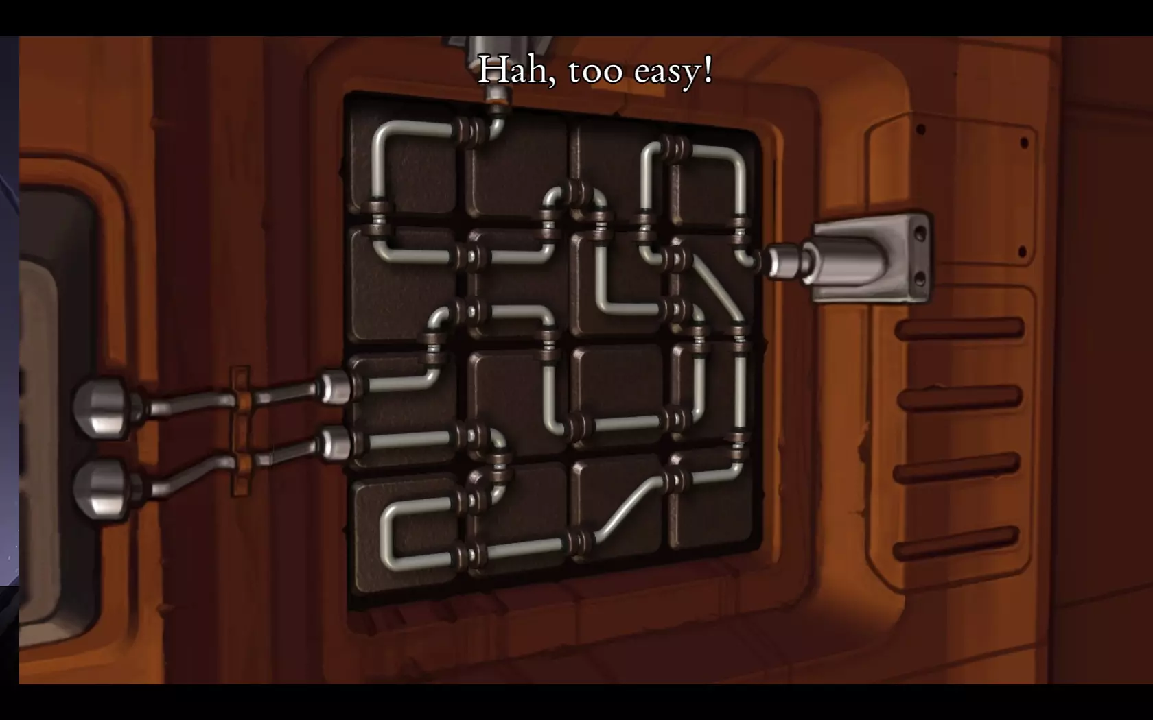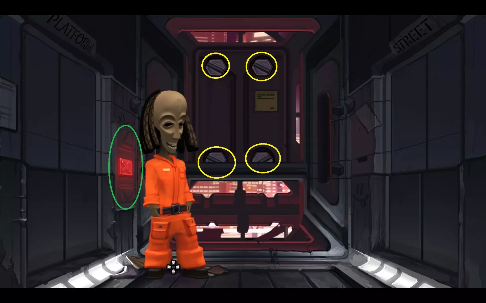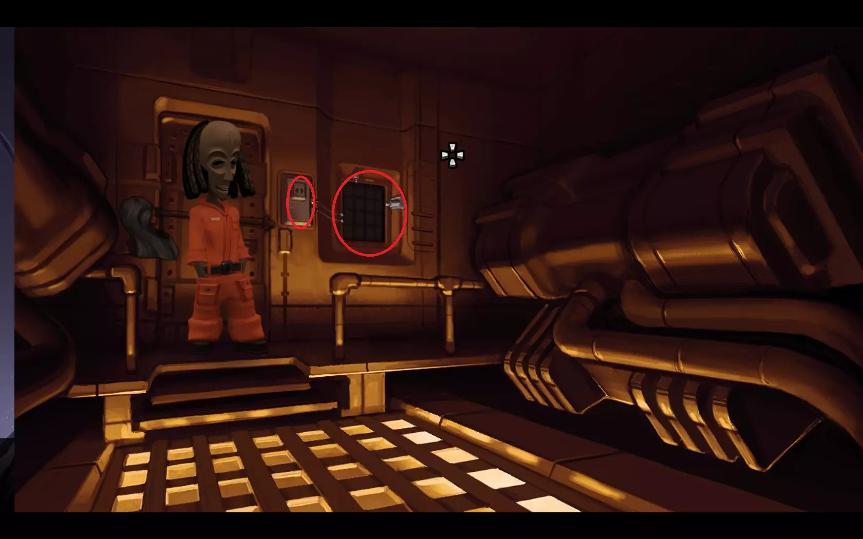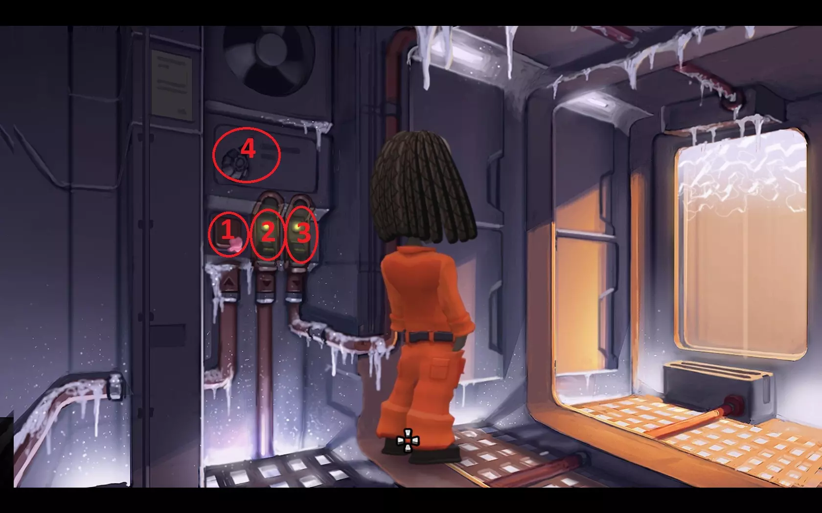 - 按下向下按钮,同时将光标准备好放在带有红色“X”标记的按钮上。 - 当看到带有四个螺栓的面板掠过时,点击带有“X”标记的按钮。 - 点击箭头,直到完全看到面板,如截图所示。 - 点击四个螺栓进行旋转,直到螺栓上的线条与面板上的线条对齐。 - 点击金属板将其移除。 - 穿过窗户。