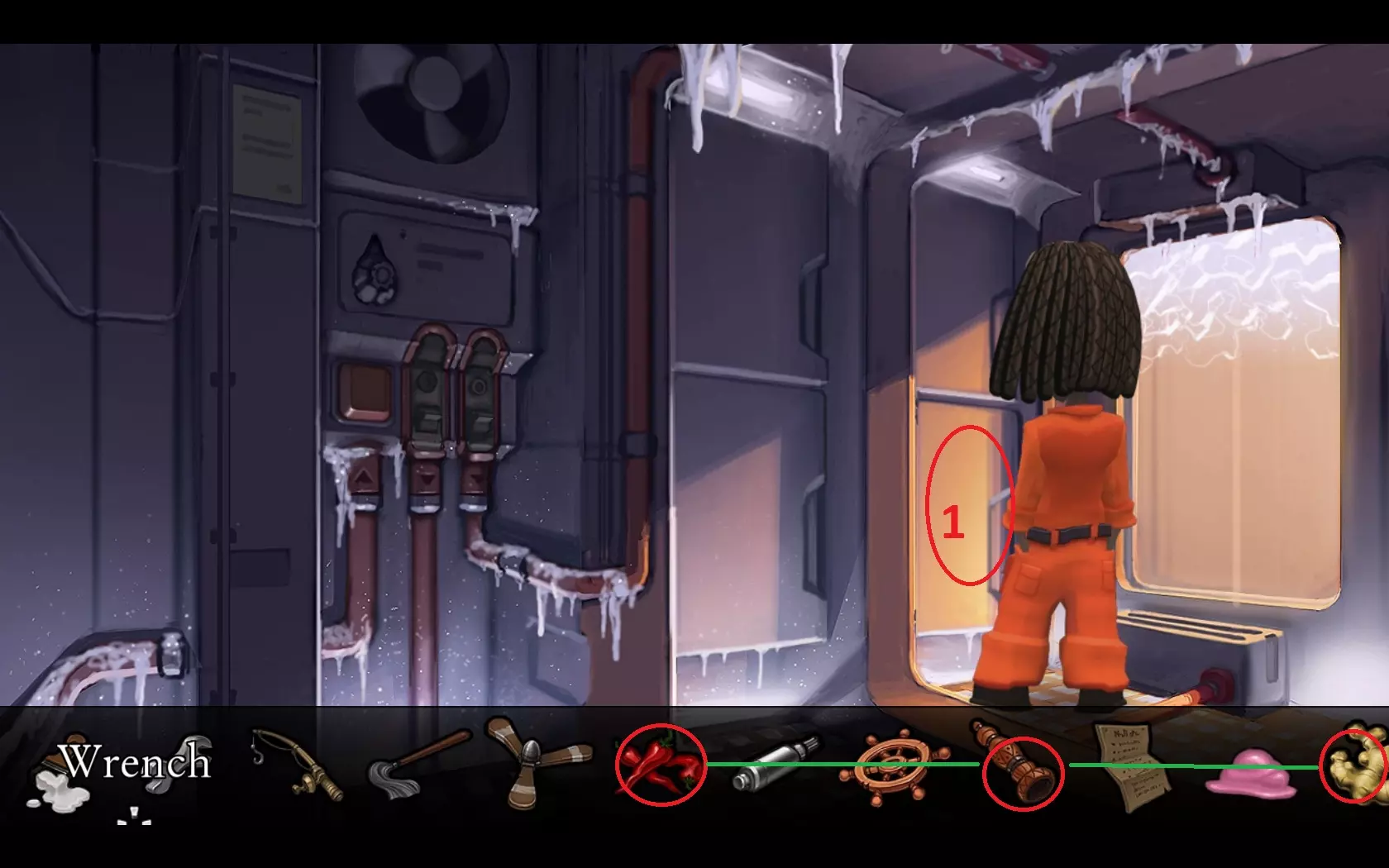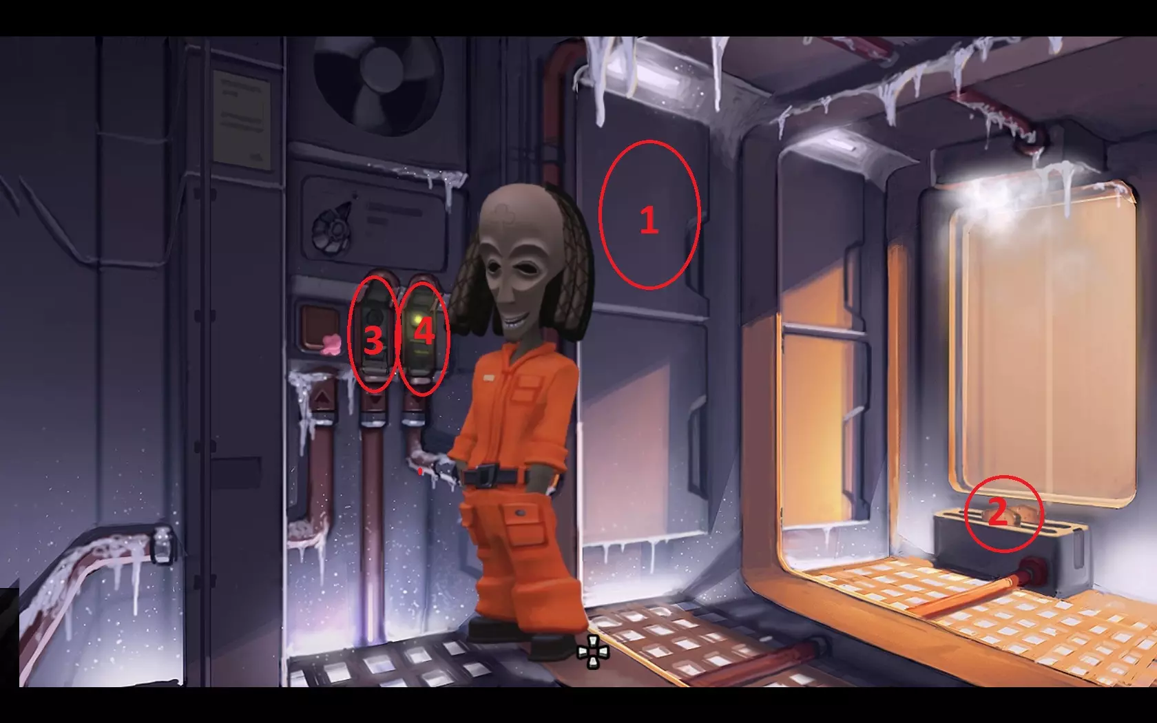 - 检查左上角的冰箱(1),找到面包。 - 将面包放入门边的暖气片(2)中。 - 关闭右侧按钮(4),然后打开中间按钮(3)。 - 拿起烤面包。 - 关闭中间按钮(3),再次按下右侧按钮(4)。 - 离开冰箱,把烤面包交给萨博。