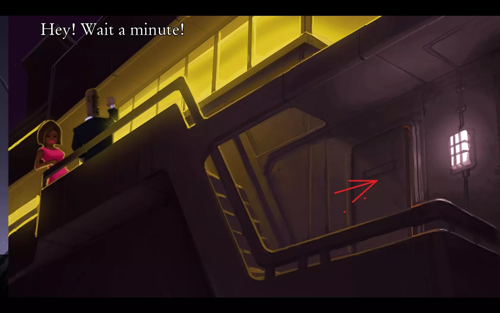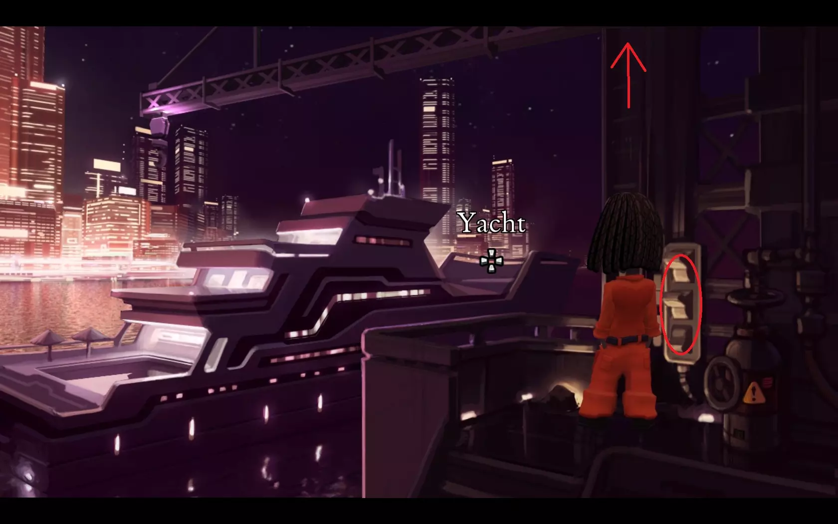 - 返回船上并前往上层甲板。 - 随意按下开关,直到角色生气并拍打开关。之后楼梯就会启动。 - 沿着楼梯上去。
