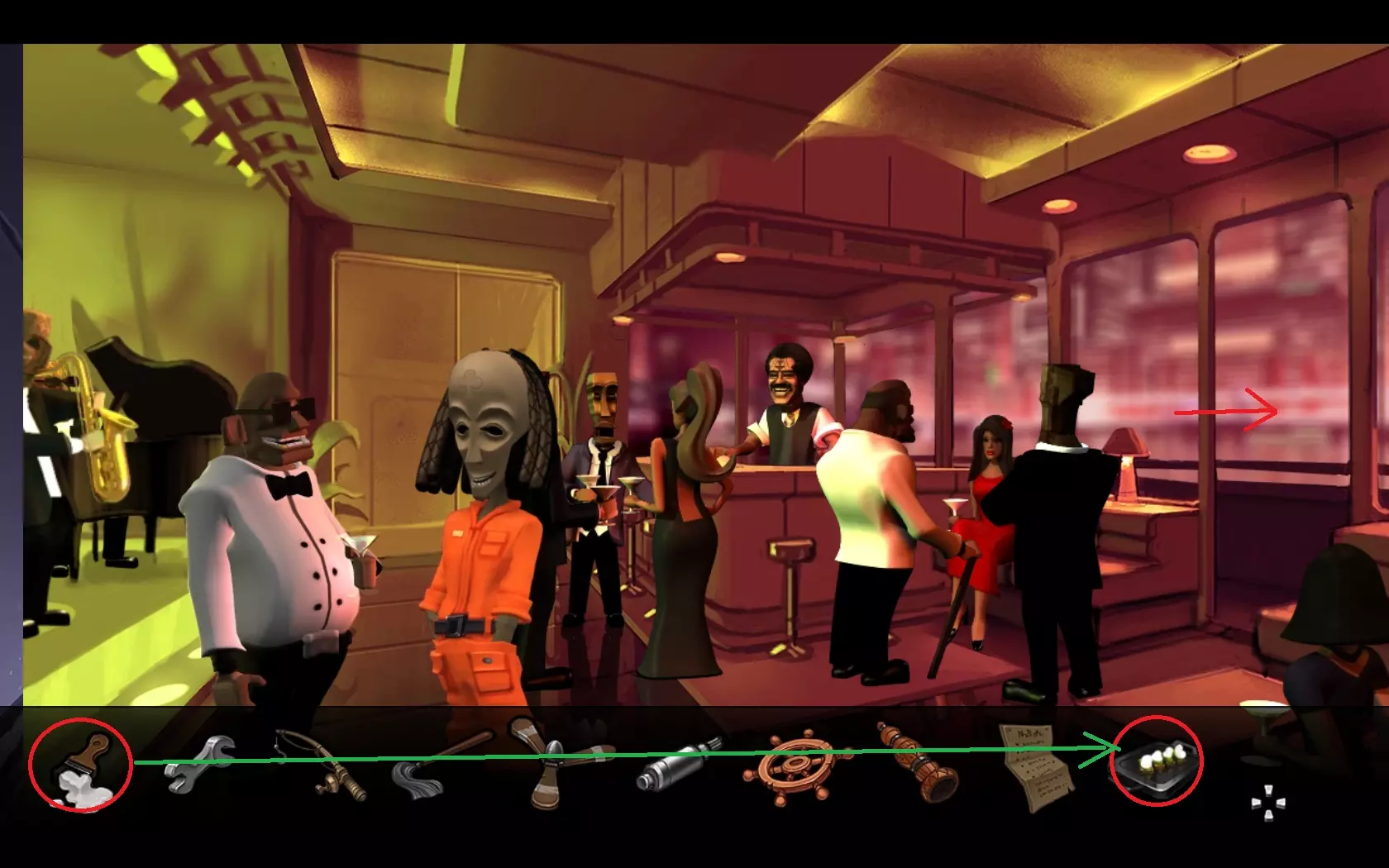 - 返回飞机,然后下到油泵(加油处)。 - 点击阀门获取机油。 - 前往鹈鹕所在的码头,点击盐袋。 - 登上船,通过梯子爬到游艇处。