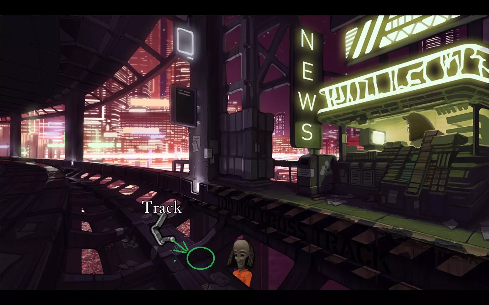 - 进入电梯并按下按钮。 - 与商人交谈并查看物品。 - 尝试将起重机手柄放在铁轨上(无论如何都无法成功,但根据剧情需要尝试) - 返回电梯。