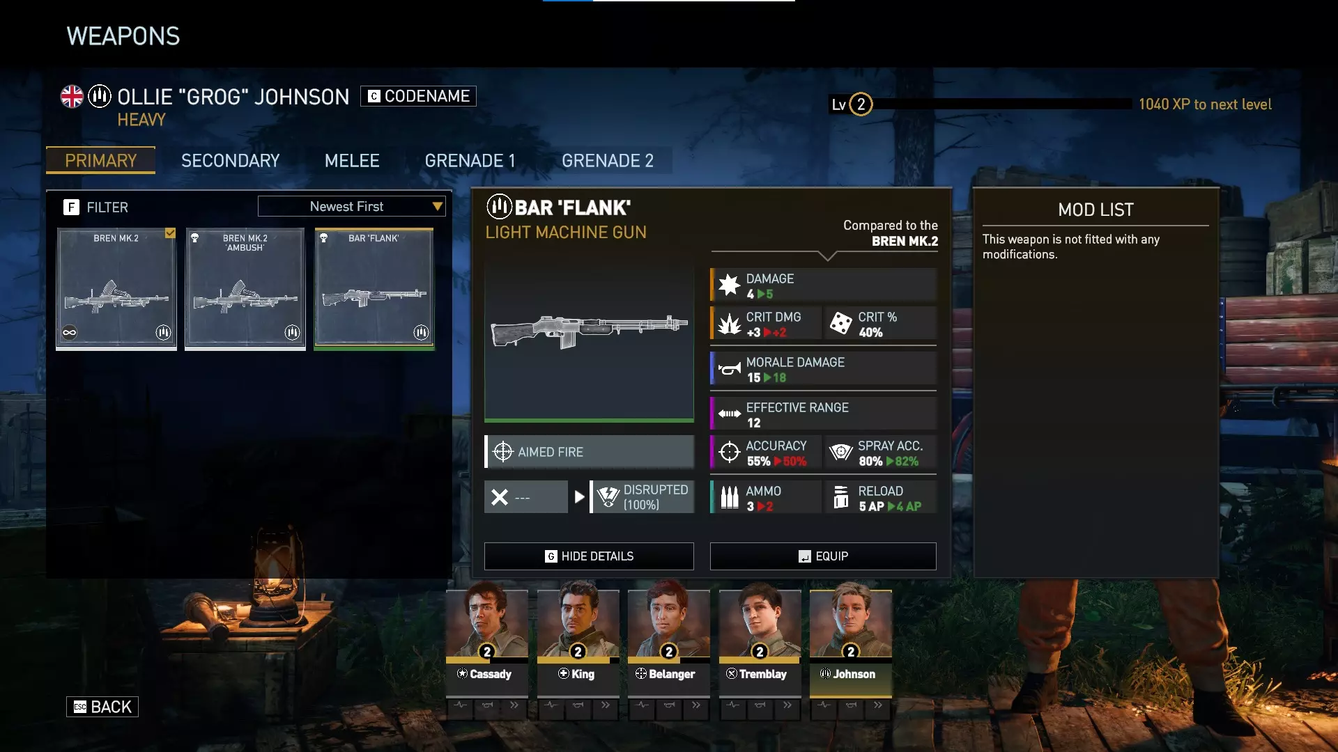 绿色等级的“侧翼”型BAR机枪比基础款布伦Mk.2拥有更高的基础伤害,但暴击伤害较低。这意味着在暴击时两者伤害相同,但“侧翼”在非暴击情况下能造成更高伤害。 此外,“侧翼”具有更高的士气伤害和必定触发的【扰乱】效果(即使未命中也能移除敌方的【守望】状态),不过重机枪手本身就能通过技能轻松获得【扰乱】能力。当然它也存在一些取舍:精准度较低,但散射精准度略高;弹容量较少,但装填消耗更低。 尽管存在一些小缺点,但我认为“侧翼”是重机枪手的最佳初始武器,并且比【游击队包】中的“伏击”型BAR机枪更强。