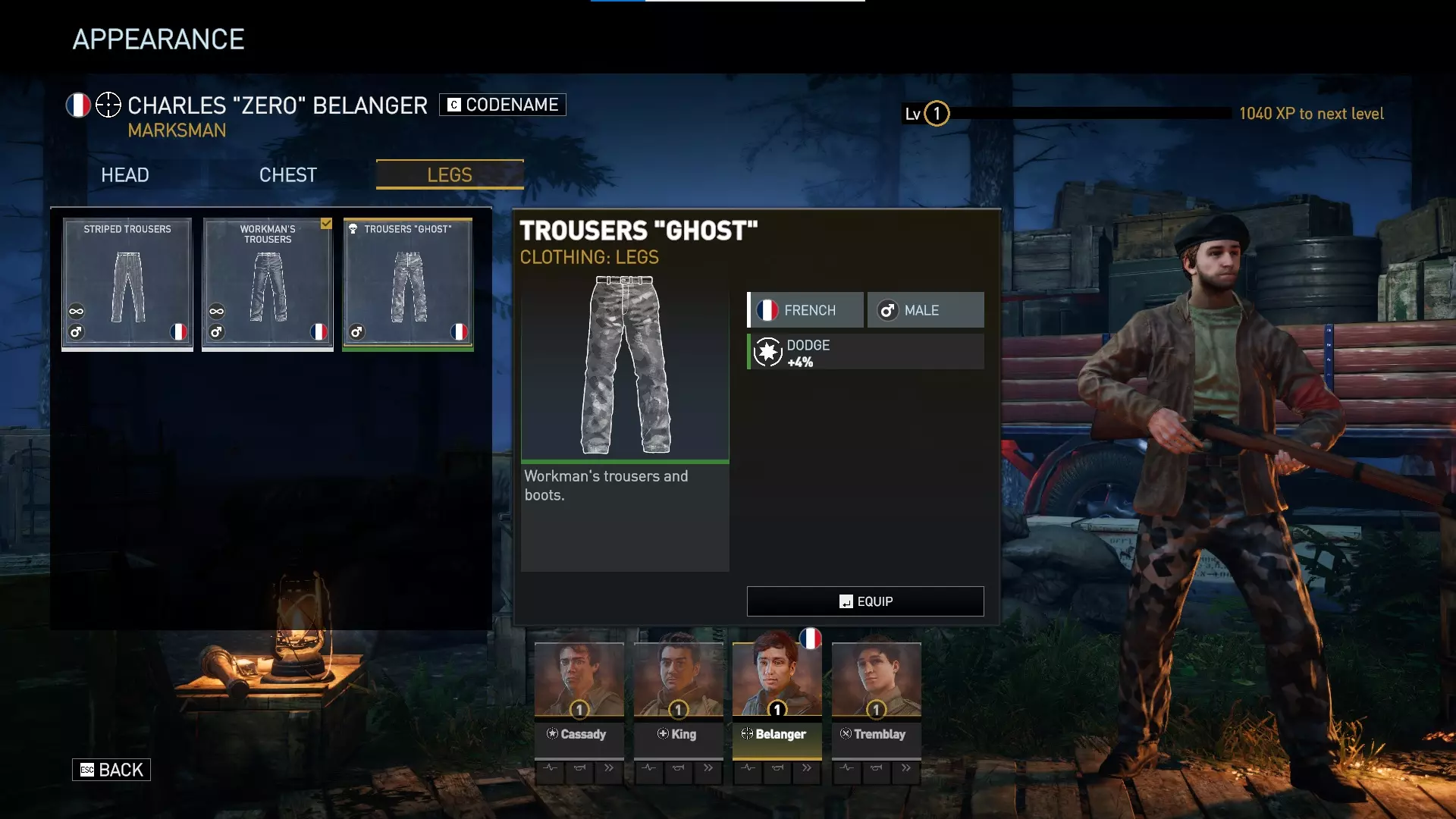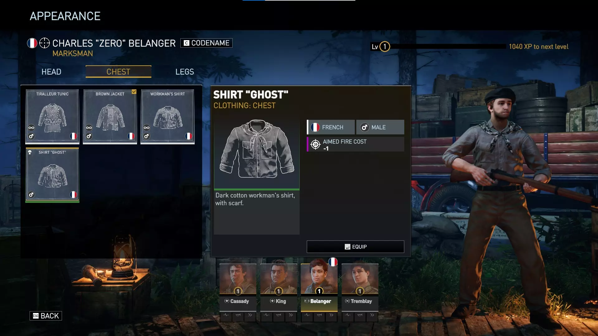 目前这些是法国男性角色仅有的DLC服装。 “幽灵”系列的三件服装可为一名法国男性角色提供+6%掩护加成、-1瞄准射击消耗以及+4%闪避。其中掩护和闪避加成较为微弱,但瞄准射击消耗减少对于能使用该效果的角色而言始终十分强力。 只有查尔斯(神射手)、雅各布(领袖)和萨米(重武器手)能从“幽灵”衬衫的-1瞄准射击消耗中获益,因为亨利(支援)和穆萨(侦察兵)仅使用腰射武器。《绝密:法国‘44年》 guerrilla pack 内容介绍 2024年3月5日推出的guerrilla pack包含以下内容: 1. 新地图——【教堂】 2. 两个全新特种行动任务: • 古墓奇兵 • 杀戮时刻 3. 两款新武器变体: • 布伦式轻机枪“伏击” • 汤普森冲锋枪“蟒蛇” 4. 全新服装套装: • 女性抵抗者“游击队员”套装 总结:这是唯一为侦察兵提供更优主武器的DLC。它为法国女性角色提供了一套强大的蓝色品质服装,比特工包提供的服装套装更优。另一款为重型兵设计的武器弱于其他DLC提供的选项。对于模组制作者而言,这似乎是唯一提供可在任务创建器中使用的新地图的DLC。它还为喜欢独特独立挑战的玩家提供了2个全新的特种行动场景。