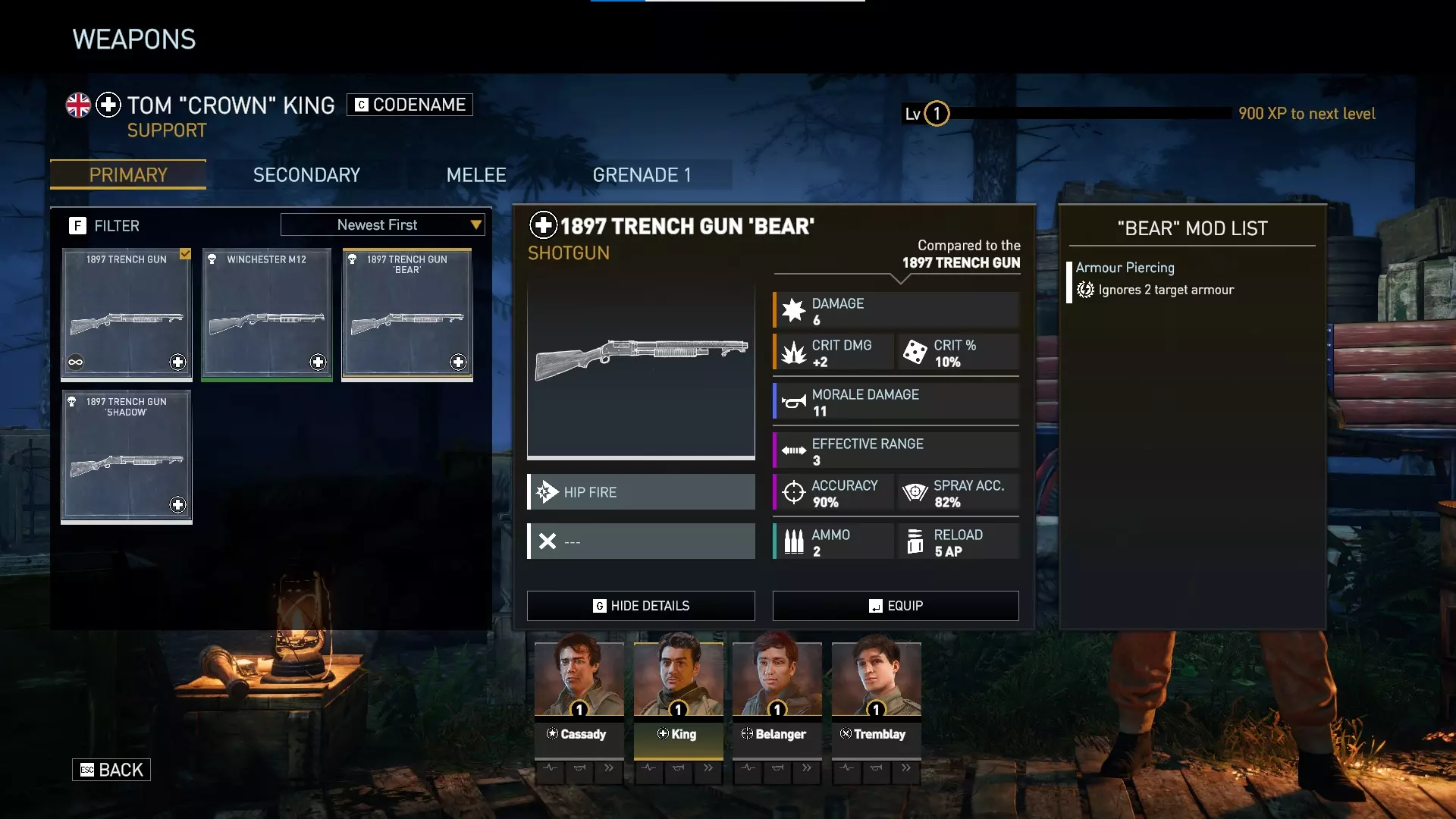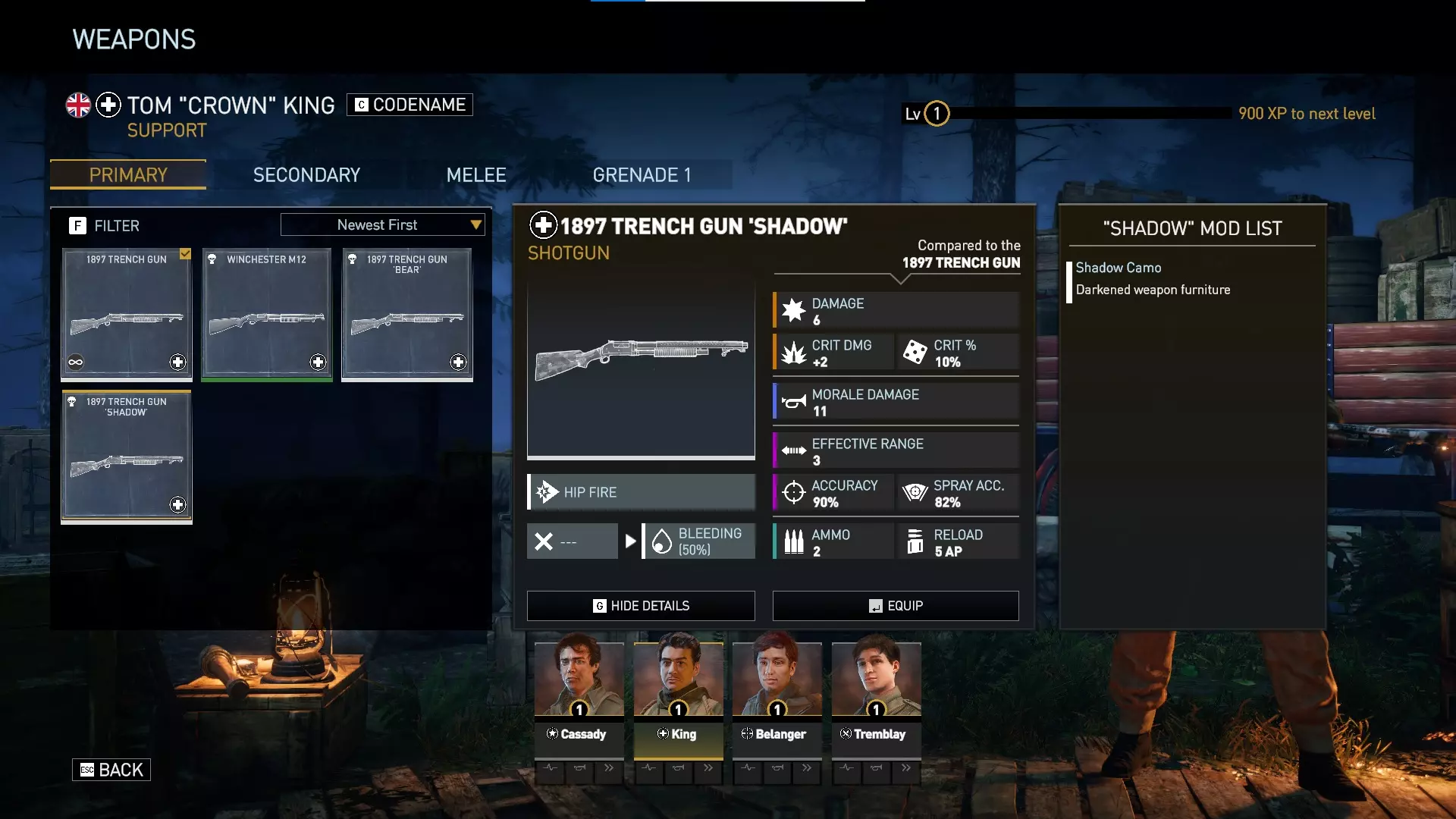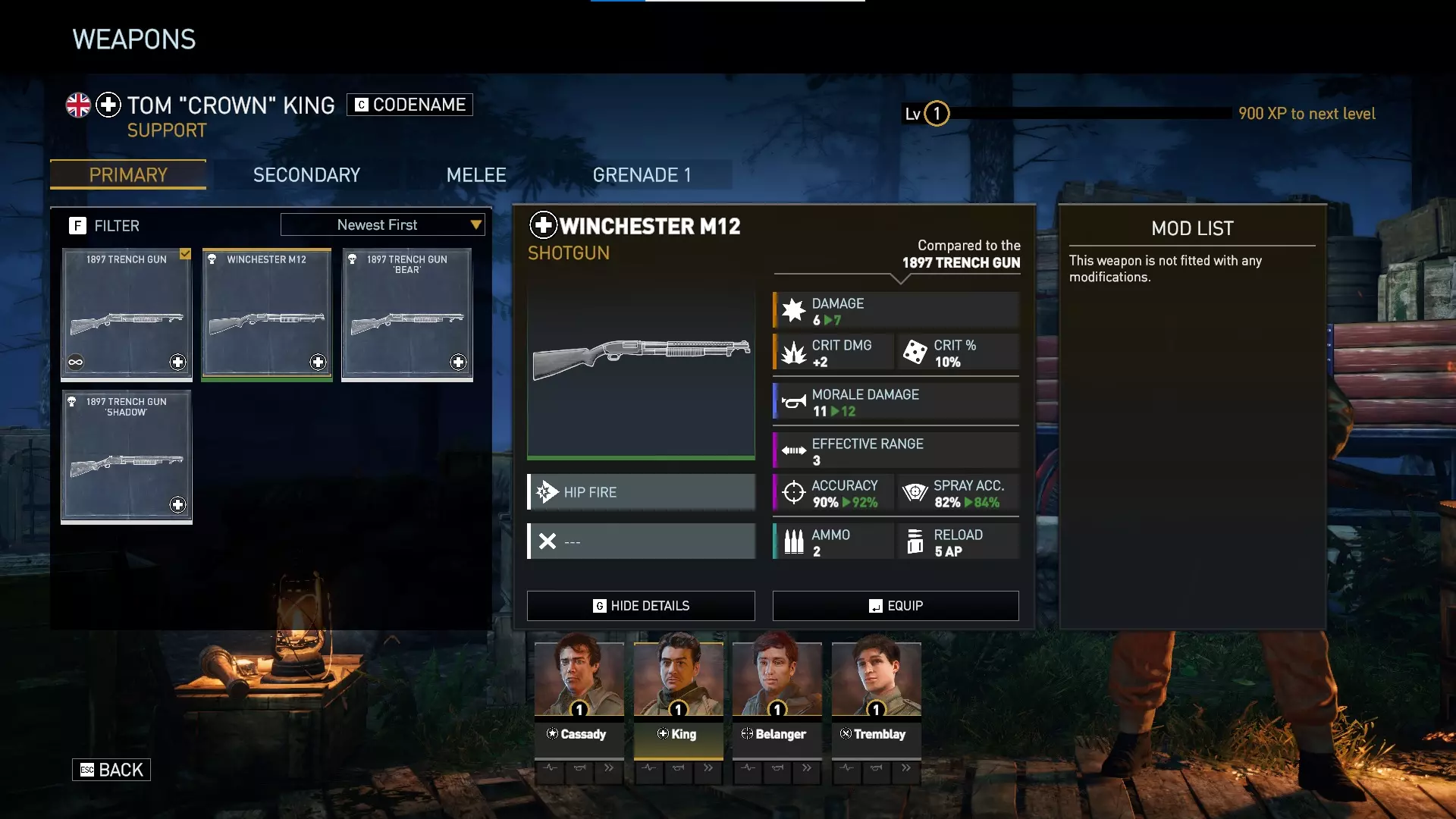 绿色等级的温彻斯特霰弹枪相比支援角色初始配备的默认1897战壕枪,具有额外伤害、额外士气伤害以及略高的精准度。它比抵抗套件和利爪包中的暗影与熊选项更强大。