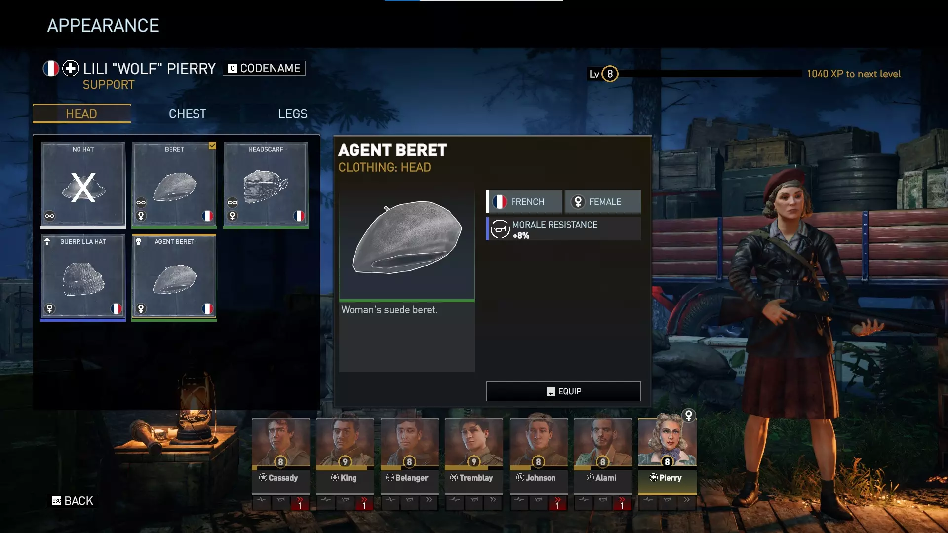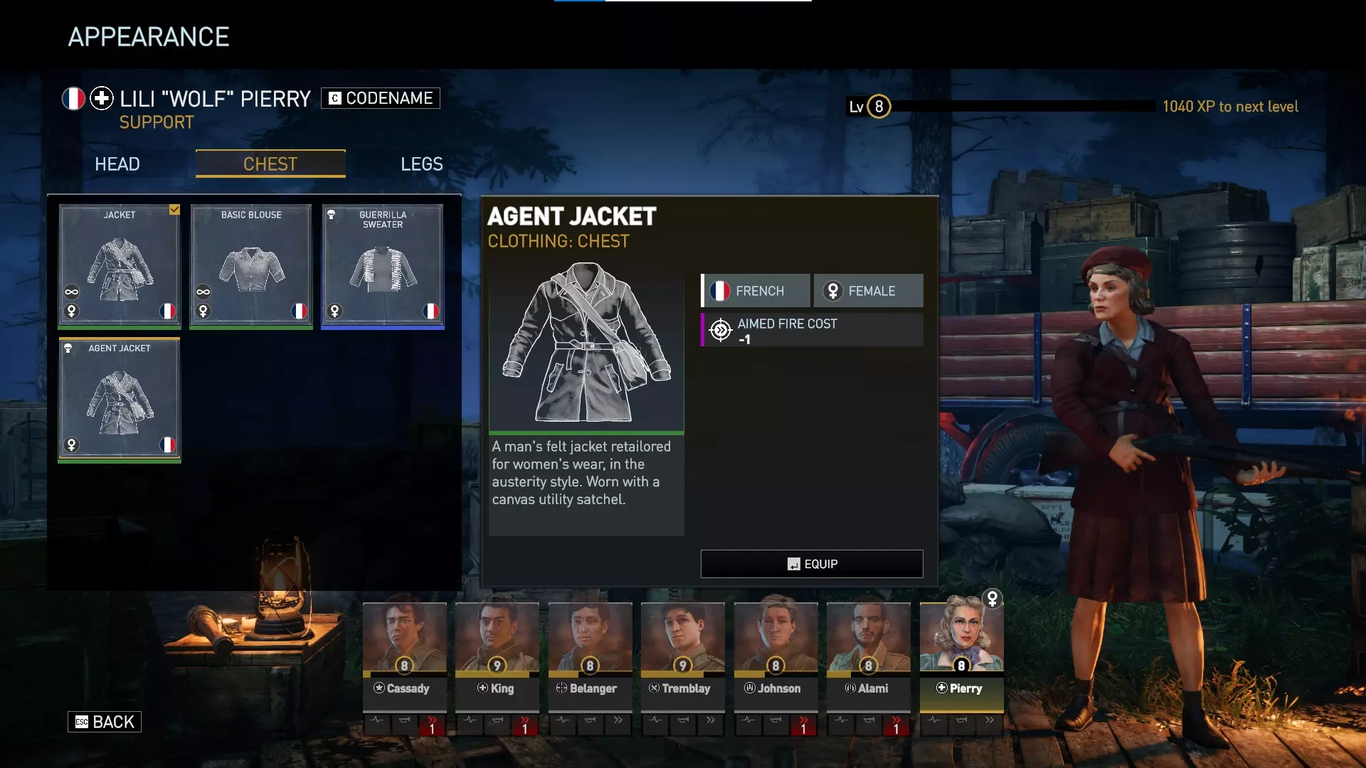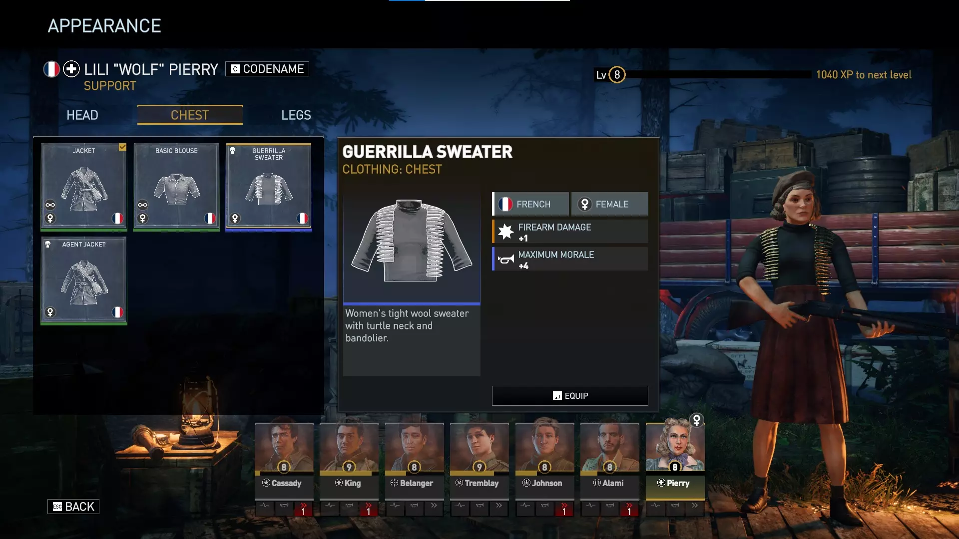对于美国男性、英国男性和法国男性角色,任何默认且数量无限的服装都仅为装饰性,不提供任何游戏内加成。有趣的是,数量无限的法国女性服装确实提供加成——贝雷帽提供+4%精准度,头巾提供+4%掩护加成,夹克提供+1生命值,基础上衣提供+4最大士气值,裙子提供+8%士气抗性,短裤提供+4%闪避率。 游击队服装为蓝色等级,提供非常强大的加成。游击帽提供+4%精准度和+4%掩护加成。游击毛衣提供+1枪械伤害和+4最大士气值。游击长裤提供+1行动点和+4%闪避率。我总是优先考虑行动点和枪械伤害,所以游击毛衣和游击长裤非常强力。精准度也总是受欢迎的,因此你可能会在游戏的大部分(甚至全部)时间里使用游击装备!游击系列服装通常比特工包中的服装更好,不过安娜(领袖)可能更喜欢特工夹克的【减少1点瞄准射击消耗】。特工包 于2024年5月1日推出,特工包包含: 新特种行动地图——【雷达】 两个新特种行动任务: • 山岭之间 • 弹无虚发 新武器: • 温彻斯特1912 新武器变体: • 伯莱塔“紧凑型” 新服装套装: • 女性抵抗组织“特工”套装 总结:此DLC为支援职业提供了最强的DLC主武器,以及一把所有角色都能使用的略强副手枪。它为法国女性角色提供了一套蓝色品质服装,其强度弱于抵抗组织套件所提供的服装,但安娜(领袖)可能会更喜欢特工夹克。特工包还为喜欢独特独立挑战的玩家提供了2个新的特种行动场景。“新地图”仅可通过【Over Hill Under Hill】特别行动游玩,无法在任务编辑器中使用,这可能会让模组制作者感到失望。 由于【Radar】地图无法在任务编辑器中使用,因此我没有该地图的图片。它只能在【Over Hill Under Hill】特别行动中看到。