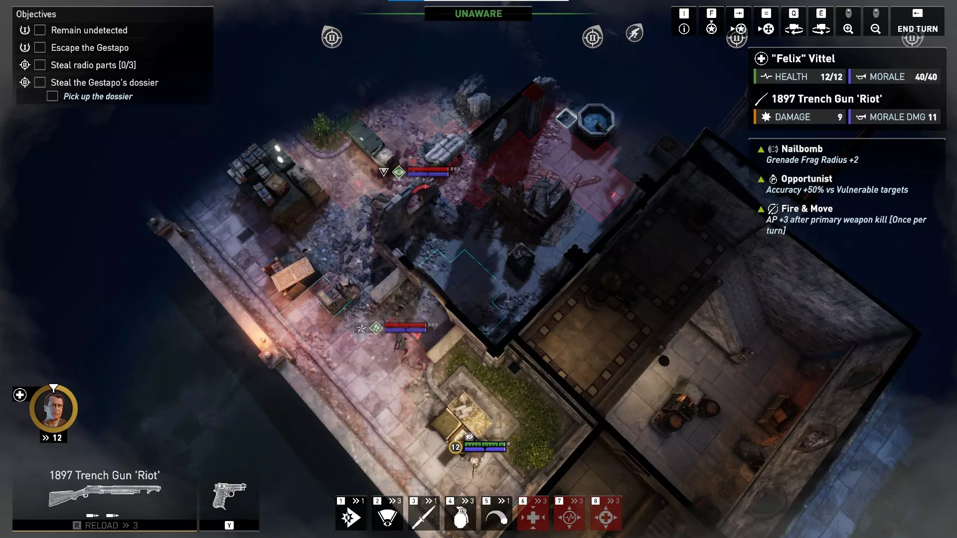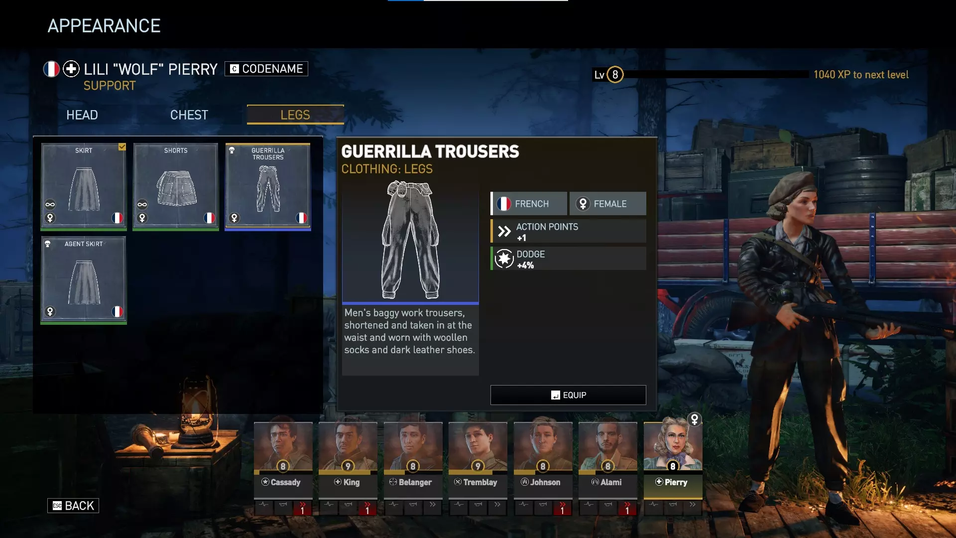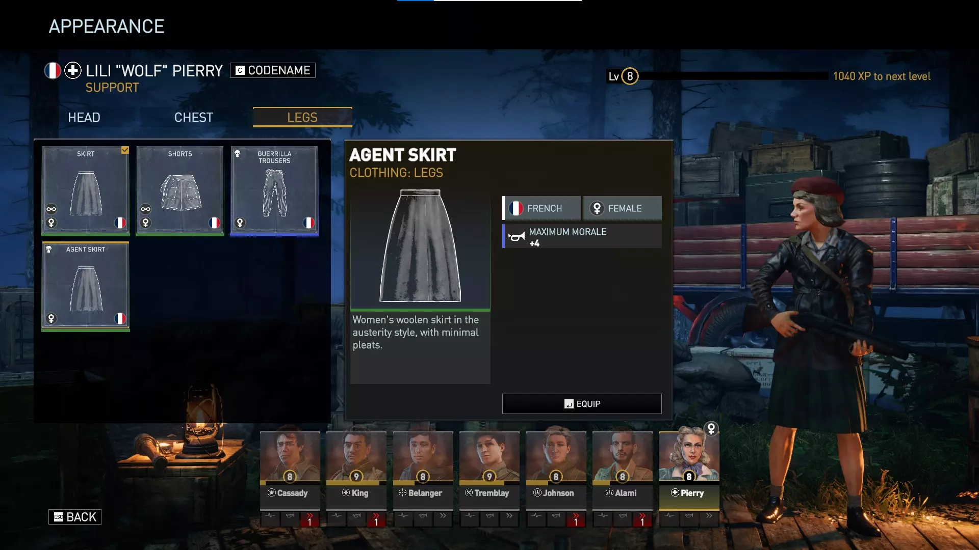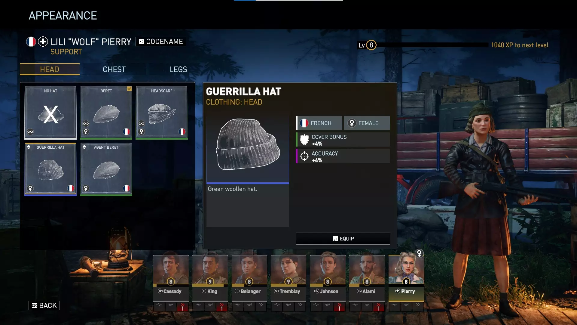 对于美国男性、英国男性和法国男性角色,任何默认且数量无限的服装都仅为装饰性,不提供任何游戏内加成。有趣的是,数量无限的法国女性服装确实提供加成——贝雷帽提供+4%精准度,头巾提供+4%掩护加成,夹克提供+1生命值,基础上衣提供+4最大士气值,裙子提供+8%士气抗性,短裤提供+4%闪避率。 游击队服装为蓝色等级,提供非常强大的加成。游击帽提供+4%精准度和+4%掩护加成。游击毛衣提供+1枪械伤害和+4最大士气值。游击长裤提供+1行动点和+4%闪避率。我总是优先考虑行动点和枪械伤害,所以游击毛衣和游击长裤非常强力。精准度也总是受欢迎的,因此你可能会在游戏的大部分(甚至全部)时间里使用游击装备!游击系列服装通常比特工包中的服装更好,不过安娜(领袖)可能更喜欢特工夹克的【减少1点瞄准射击消耗】。特工包 于2024年5月1日推出,特工包包含: 新特种行动地图——【雷达】 两个新特种行动任务: • 山岭之间 • 弹无虚发 新武器: • 温彻斯特1912 新武器变体: • 伯莱塔“紧凑型” 新服装套装: • 女性抵抗组织“特工”套装 总结:此DLC为支援职业提供了最强的DLC主武器,以及一把所有角色都能使用的略强副手枪。它为法国女性角色提供了一套蓝色品质服装,其强度弱于抵抗组织套件所提供的服装,但安娜(领袖)可能会更喜欢特工夹克。特工包还为喜欢独特独立挑战的玩家提供了2个新的特种行动场景。“新地图”仅可通过【Over Hill Under Hill】特别行动游玩,无法在任务编辑器中使用,这可能会让模组制作者感到失望。 由于【Radar】地图无法在任务编辑器中使用,因此我没有该地图的图片。它只能在【Over Hill Under Hill】特别行动中看到。