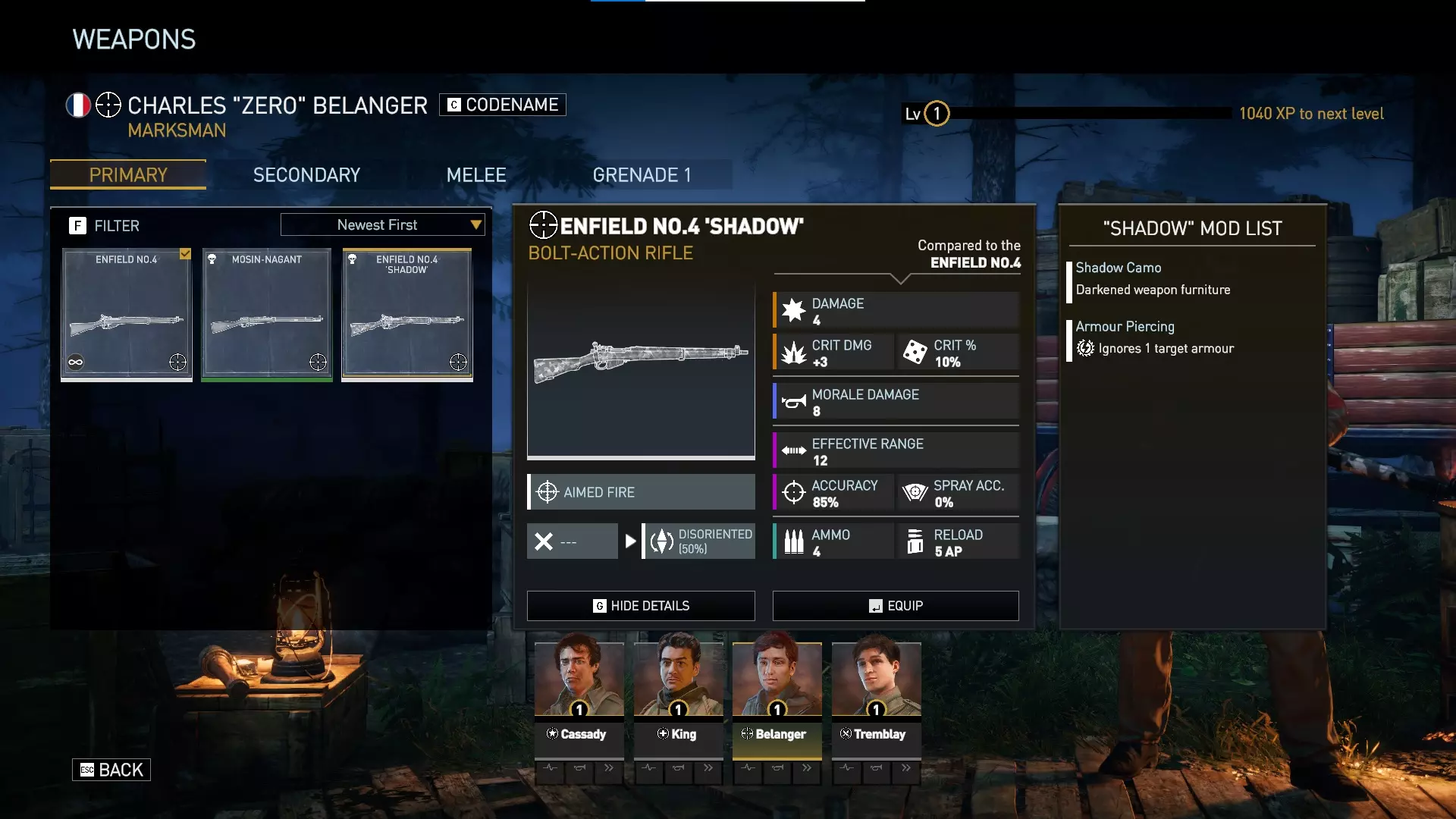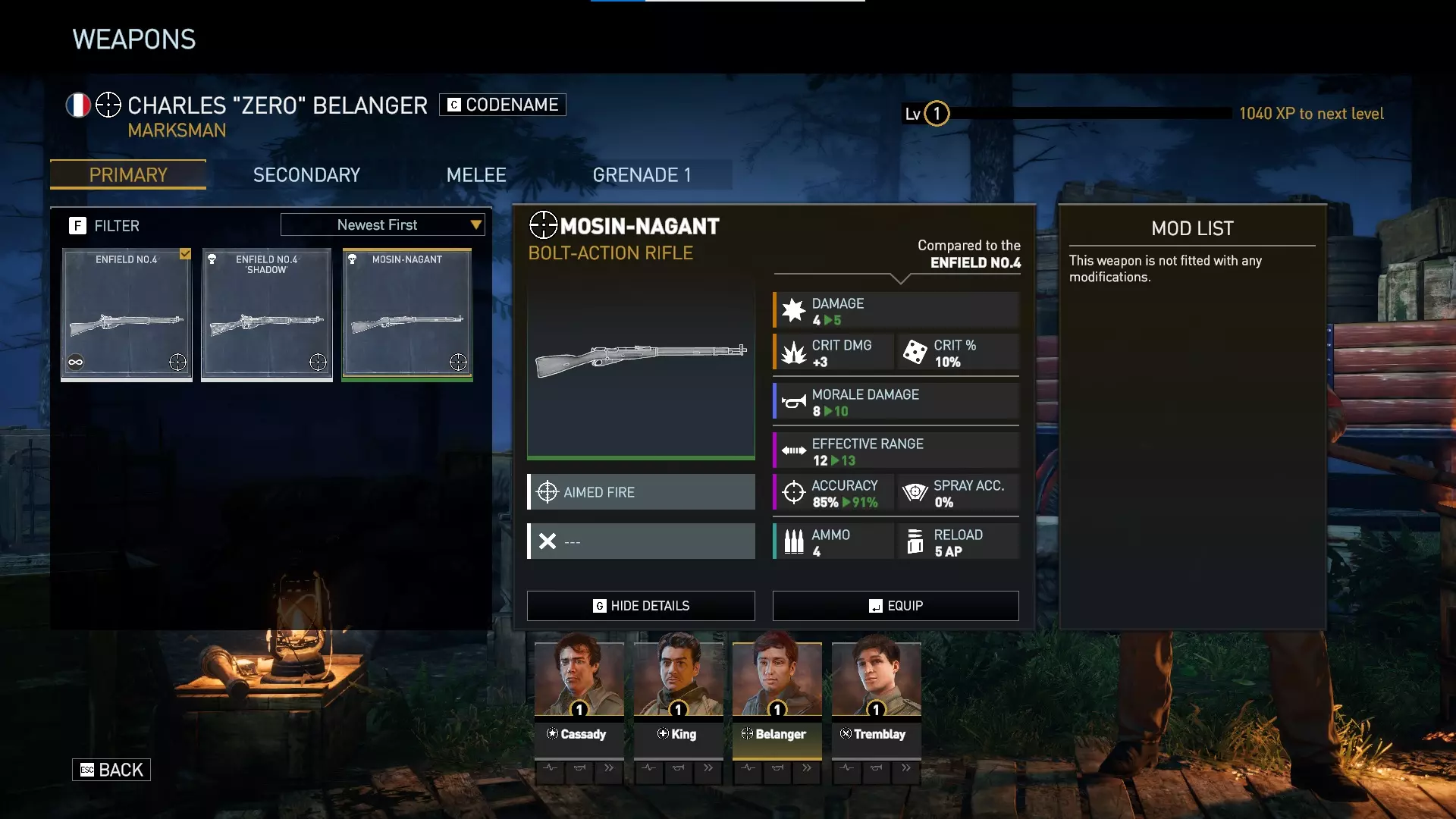 绿色等级的莫辛-纳甘步枪相比神射手初始配备的标准恩菲尔德步枪,拥有更高的伤害、更高的士气伤害、更远的有效射程以及更好的精准度。它比抵抗套件中的暗影选项更加强力。
