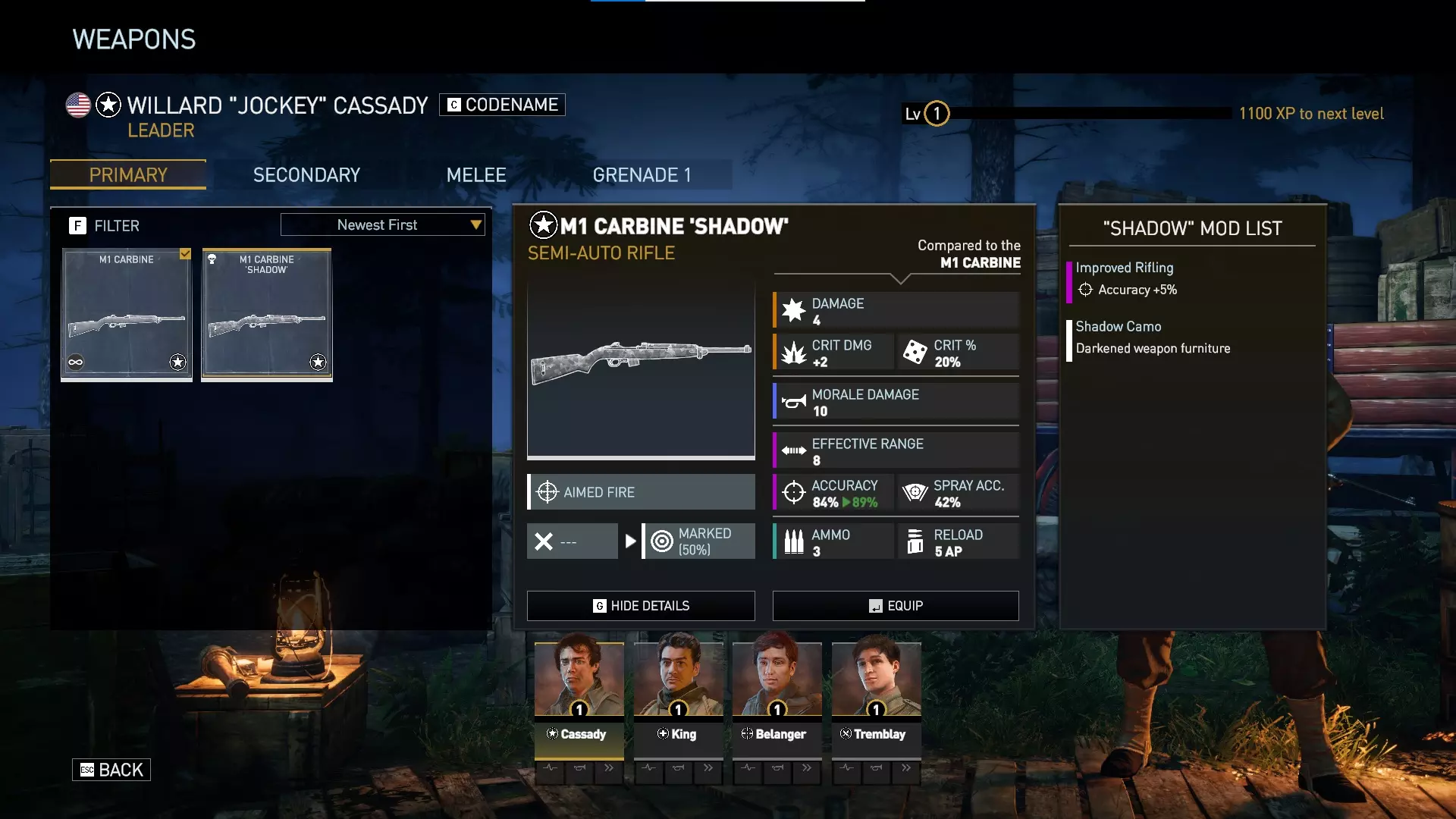 这是目前领袖可用的唯一DLC主武器。M1卡宾枪“暗影”是默认M1卡宾枪的不错升级,它提供额外+5%的 accuracy(精准度),并有50%的几率对敌人施加【标记】状态(被标记的敌人会自动受到攻击的暴击伤害)。