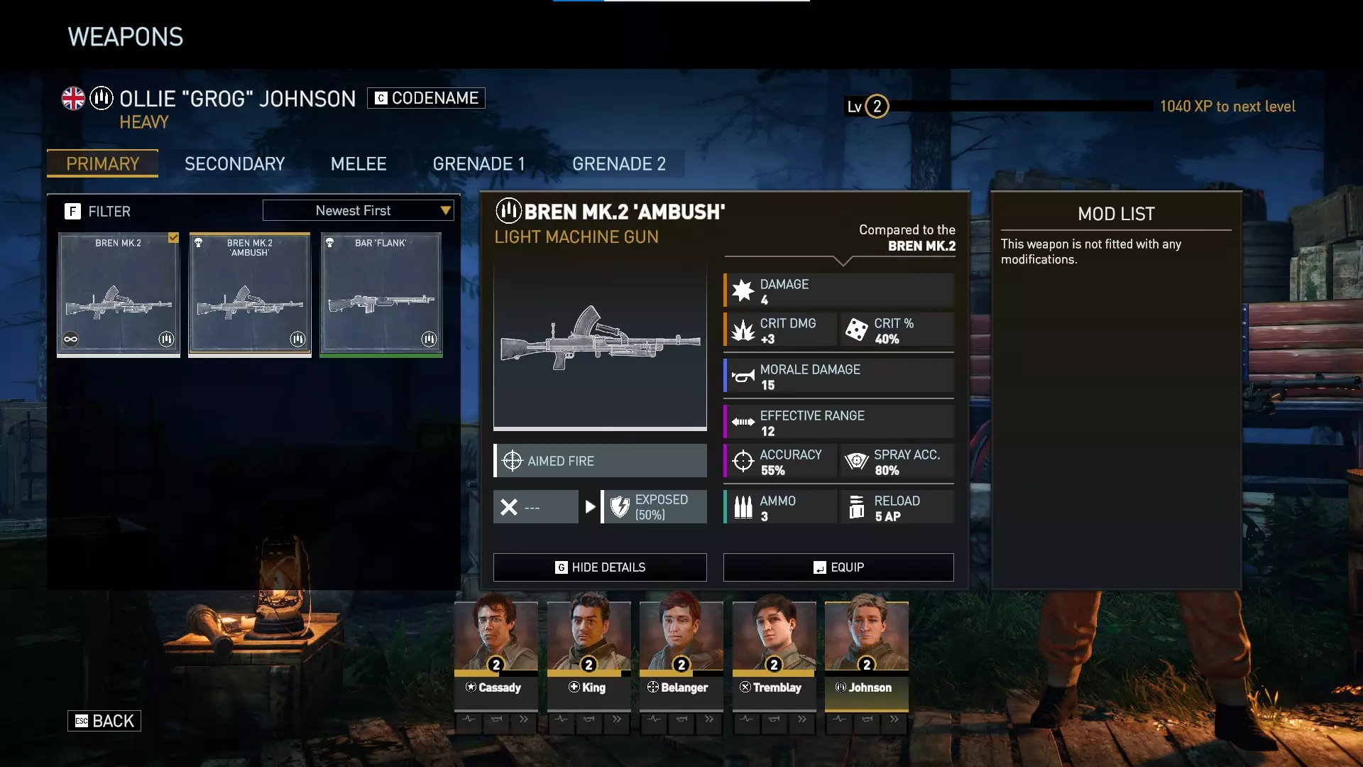 与重型兵初始配备的普通布伦Mk.2相比,布伦“伏击”有50%的几率对敌人施加【暴露】状态(【暴露】最多可使敌人的掩护加成降低30%)。不过,重型兵更强的武器选择是来自【恶魔包】的绿色品质巴尔“侧袭”。