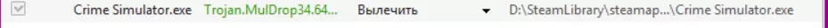 用户为删除特洛伊木马,下载杀毒软件对游戏文件进行病毒查杀,检测到名为Trojan.MulDrop34.64...的特洛伊木马,该木马存在于游戏文件Crime Simulator.exe中,用户对查杀结果进行了截图。