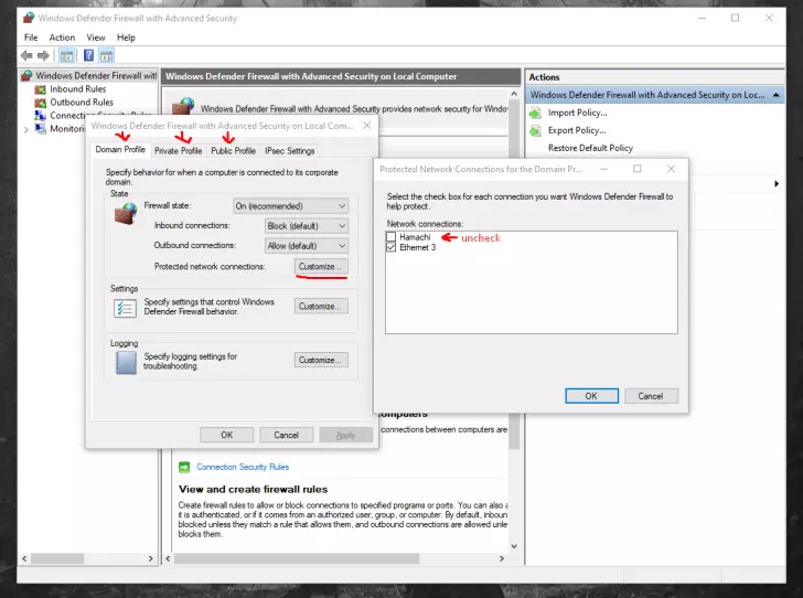 验证你能否ping通主机: ping <IP> 如果失败,你必须调整防火墙设置: 前往Windows防火墙 > 高级设置 公用配置文件(假设你的Hamachi网络是公用的) 受保护的网络连接 确保Hamachi未被勾选 应用更改