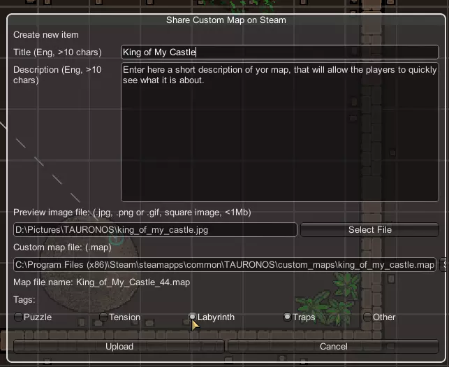 填写你的地图标题和描述。 选择你之前保存的截图作为预览图。 从custom_maps文件夹或你保存地图的位置选择已完成的地图。 选择与你的地图玩法相匹配的标签。 当所有这些都填写完毕后,上传按钮将变为可用状态,点击上传即可。