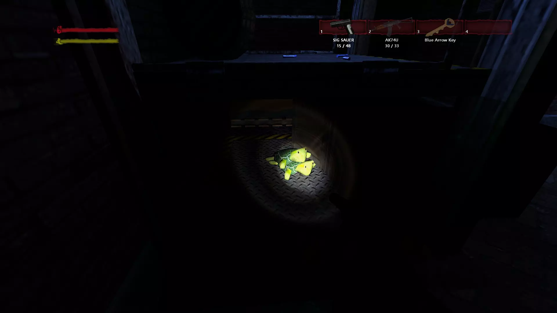 “军事前哨”/“Military Outpost” 在帐篷营地击退僵尸后,你需要再次前往下水道。沿着下水道前进,会来到一个有四盏绿灯和地面上有红色箭头的房间。左侧是倾斜的毒气区域,你需要向右转,并使用从上个关卡带来的钥匙打开绕行通道。检查房间时,你会在架子上发现乌龟。在本关卡打开所有需要的门后,可以扔掉钥匙。