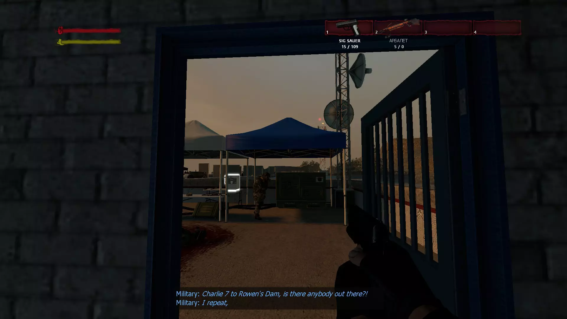 “罗文水坝:顶部”离开房间后,你会看到一座带桅杆的塔。进入塔内,从左侧的盾牌后面拿起防毒面具。现在返回并走向隧道。在隧道尽头的左侧有一扇门。沿着楼梯下去,进入充满毒气的房间。进入武器库前先环顾四周。