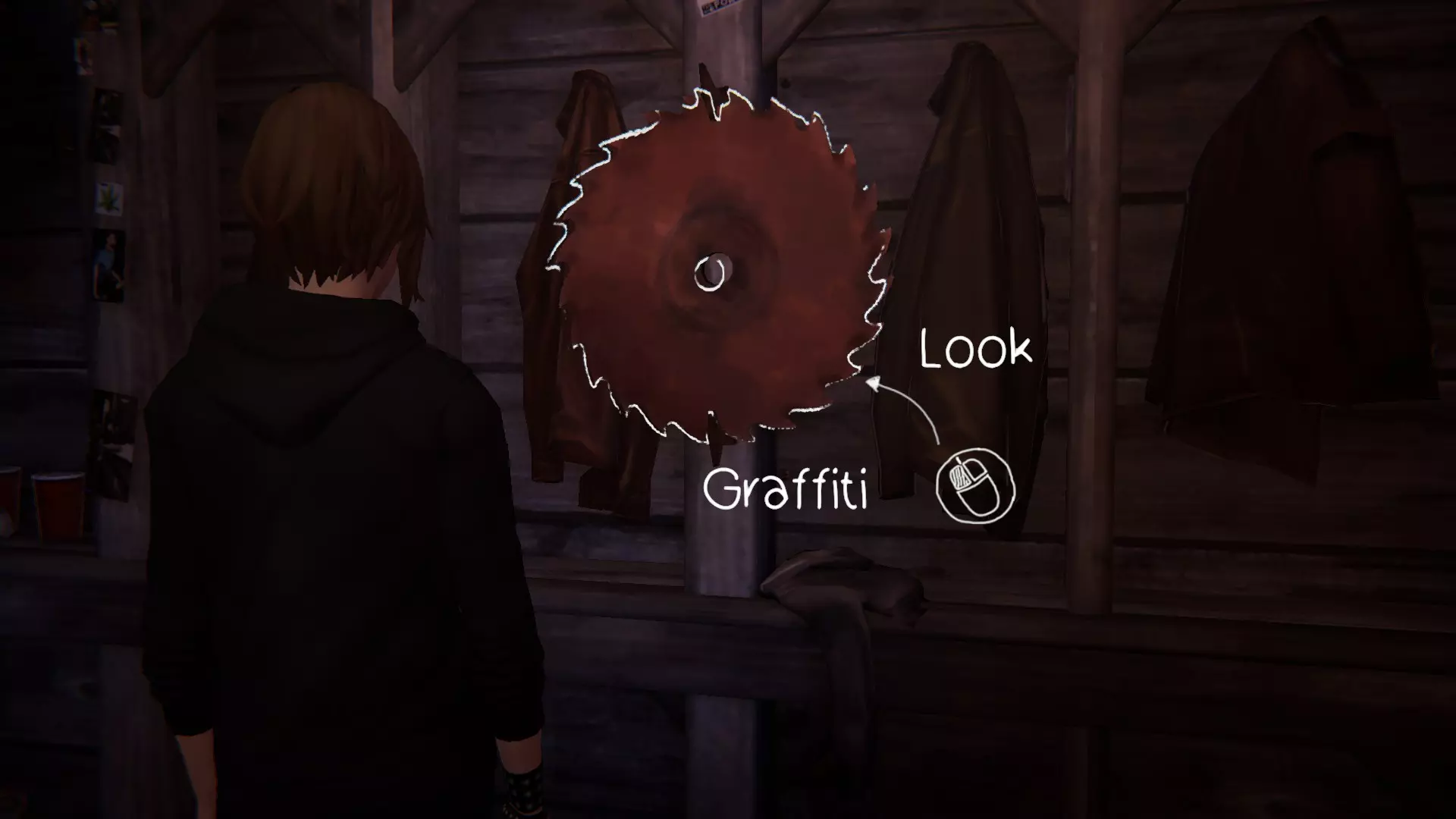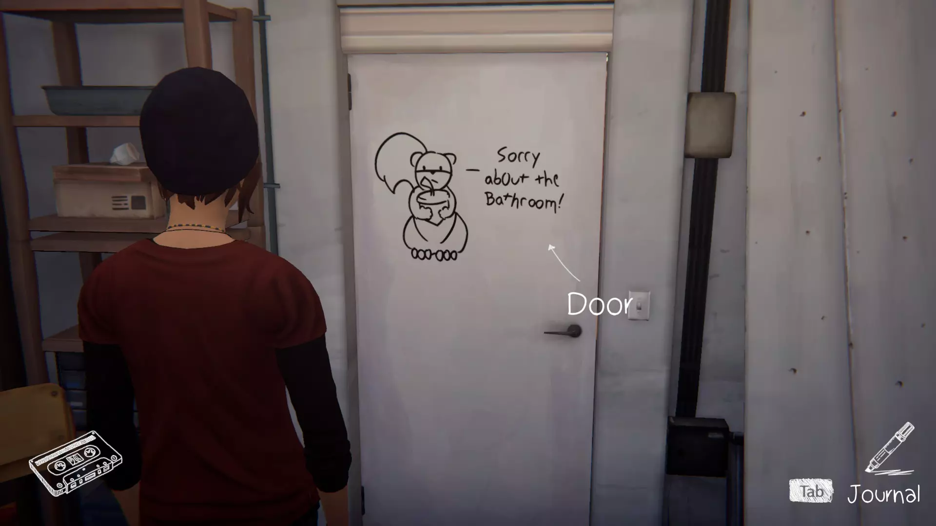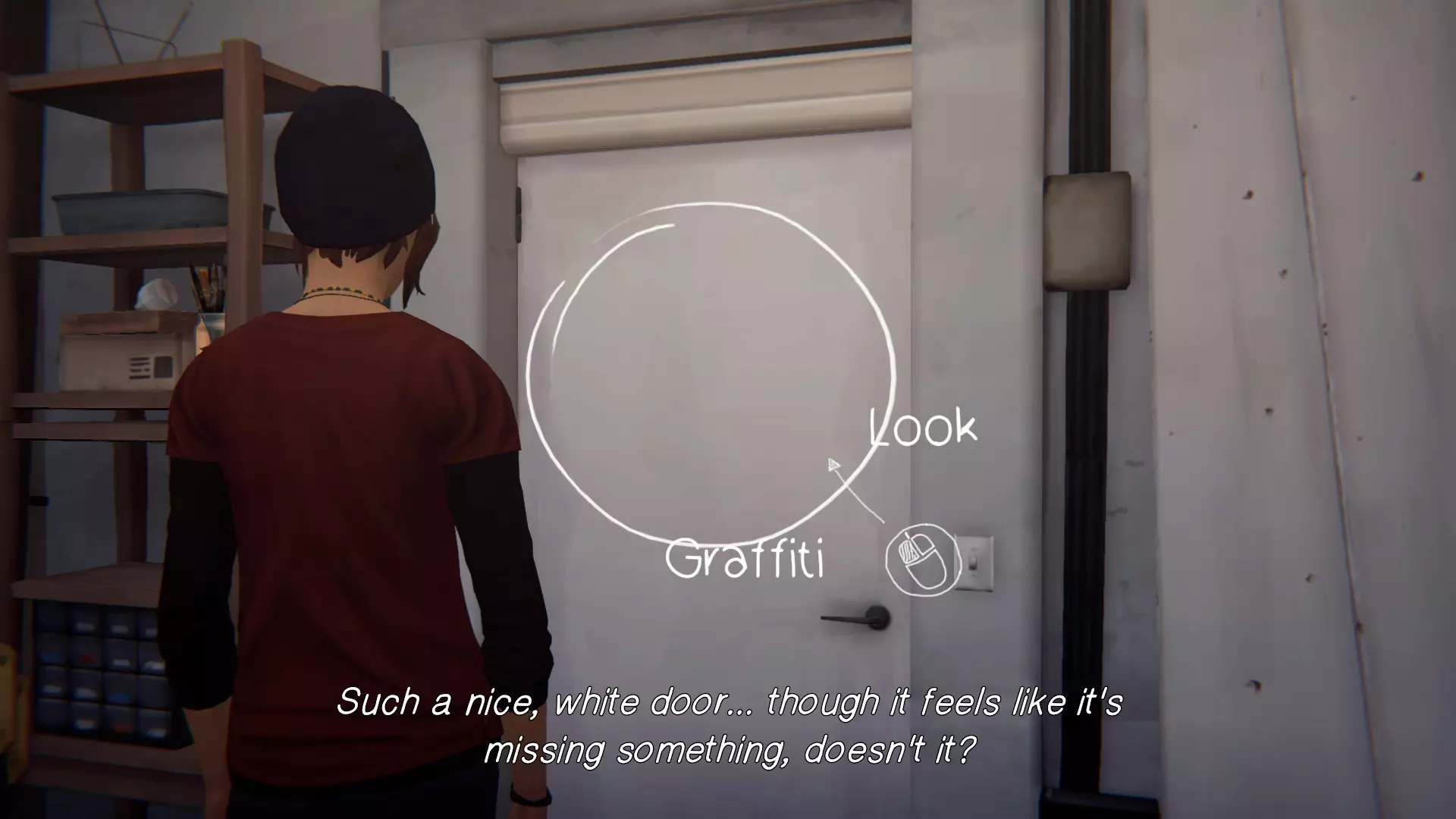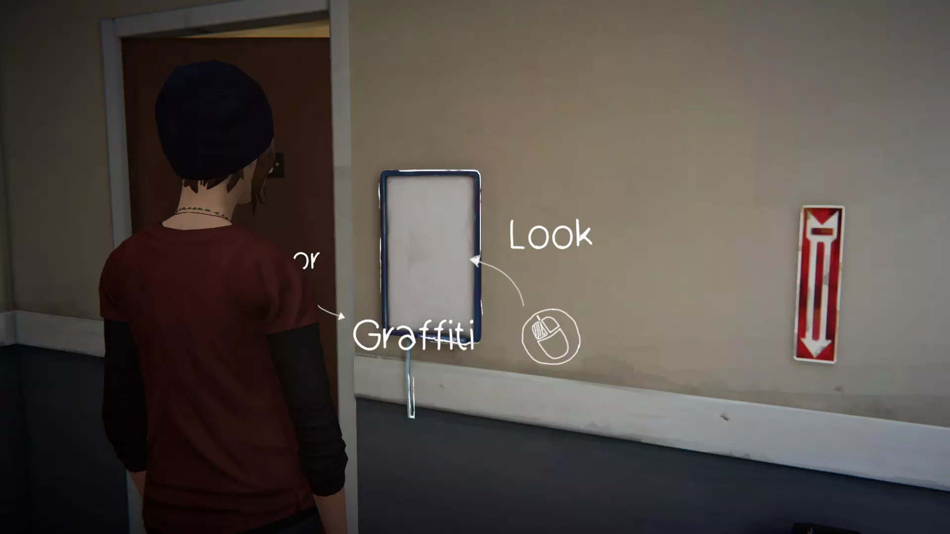 5. 宿舍。[2/2] 第六处涂鸦地点是塞缪尔房间的门。 要在墙上涂鸦,需要“支开”塞缪尔。可以通过先吓走图腾上的鸟,然后弄坏喷雾器来实现,这样埃文就不会妨碍我们了。