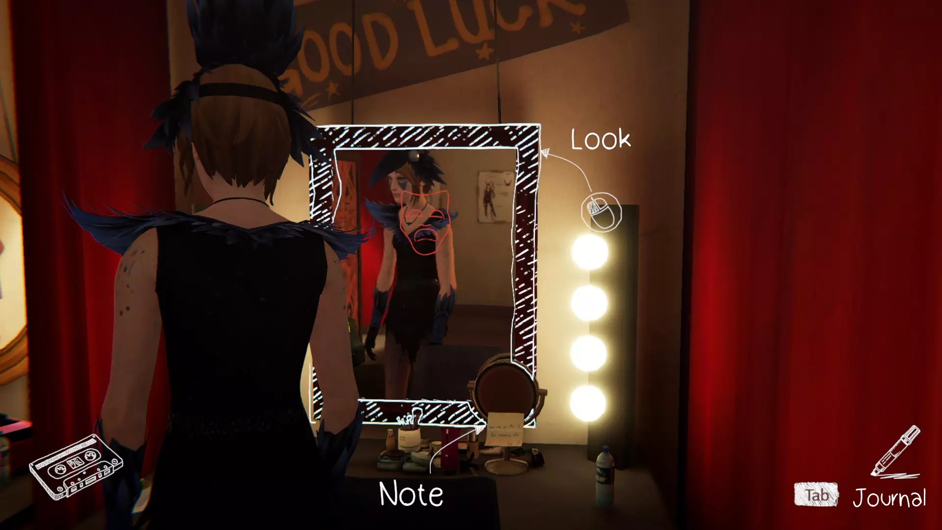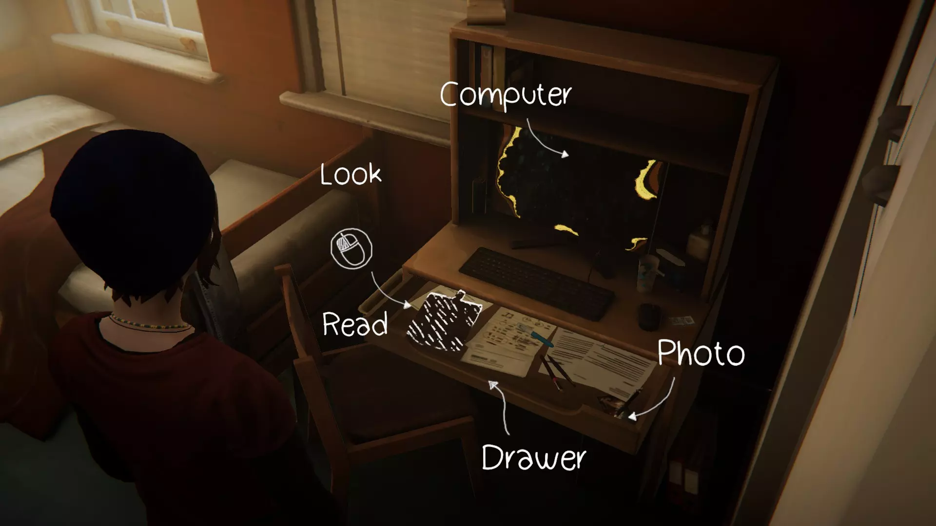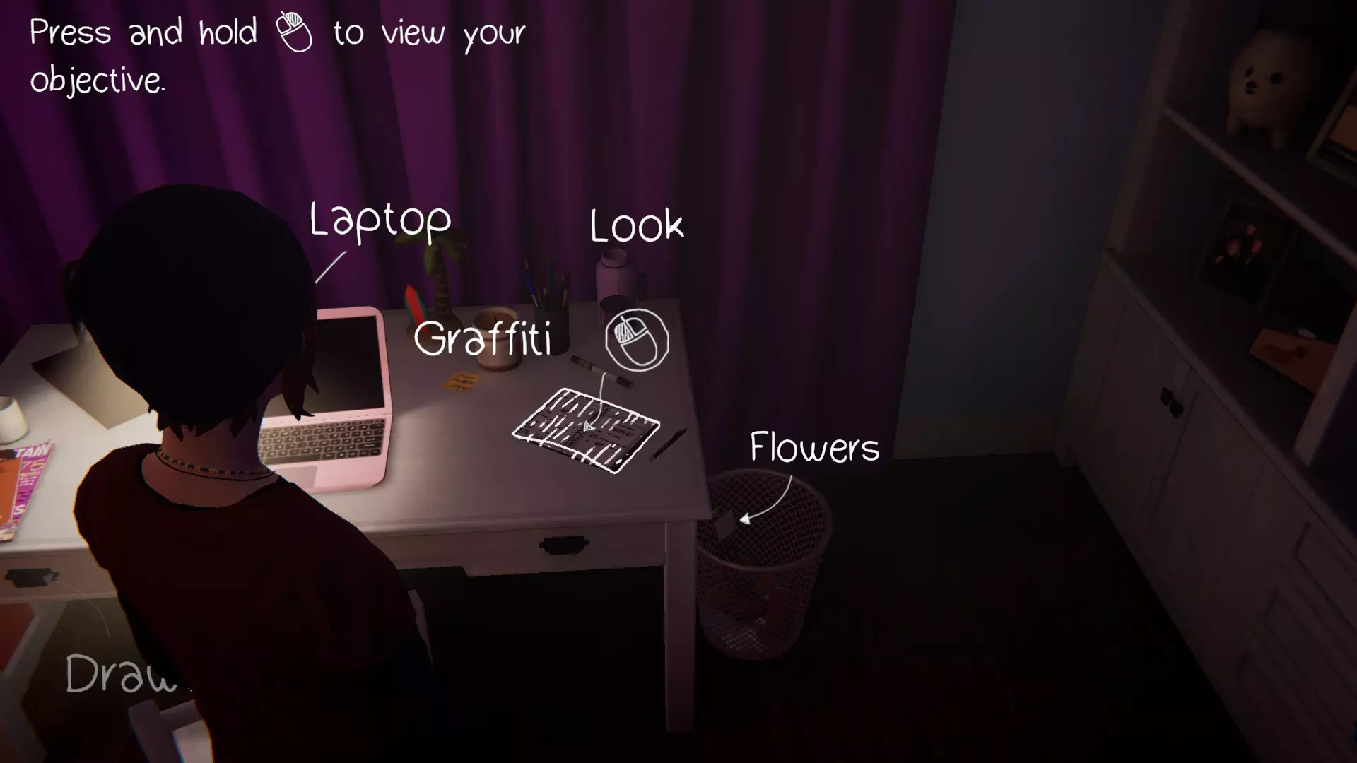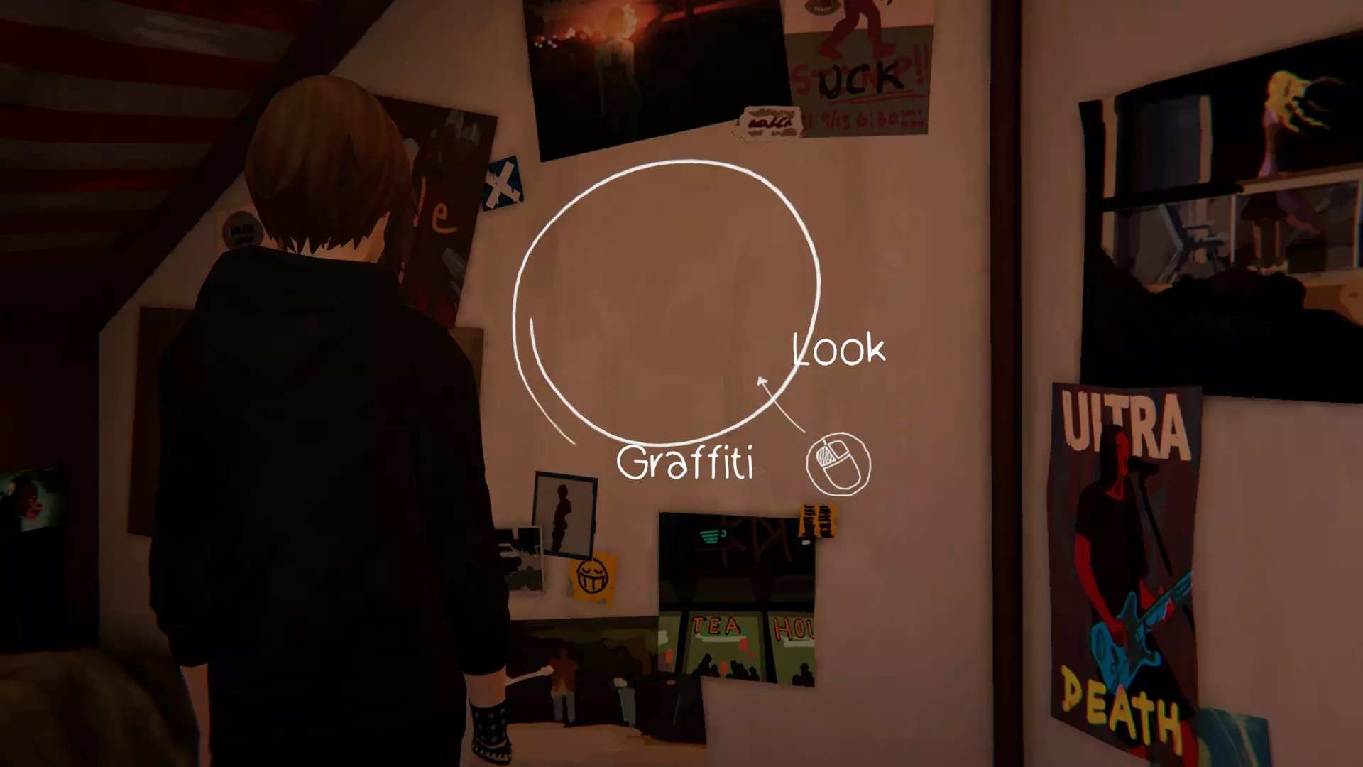 完成章节流程。获得章节通关成就。 第三章:万念俱灰。 1. 瑞秋的房间。[2/2] 第一个涂鸦地点在瑞秋的桌子上。 在日记本上写笔记。获得成就。