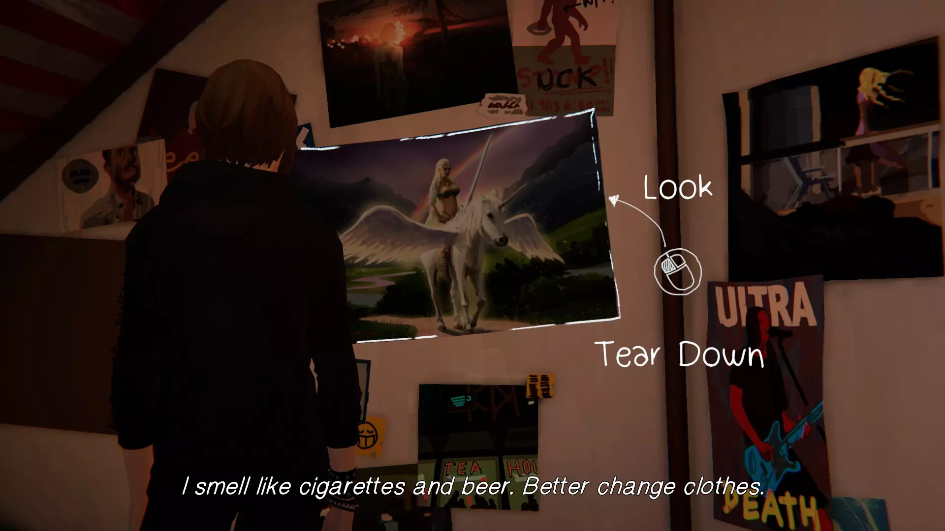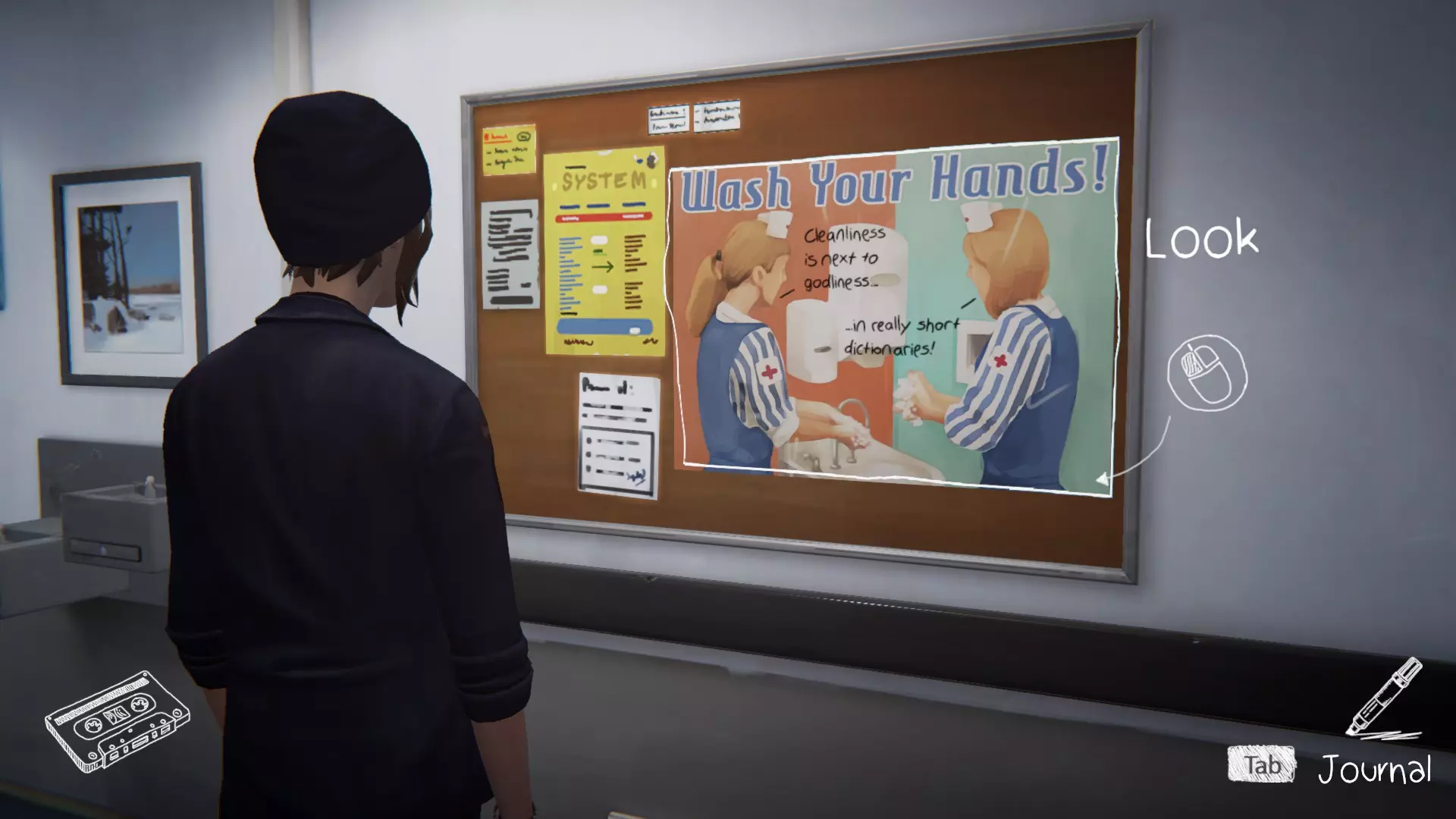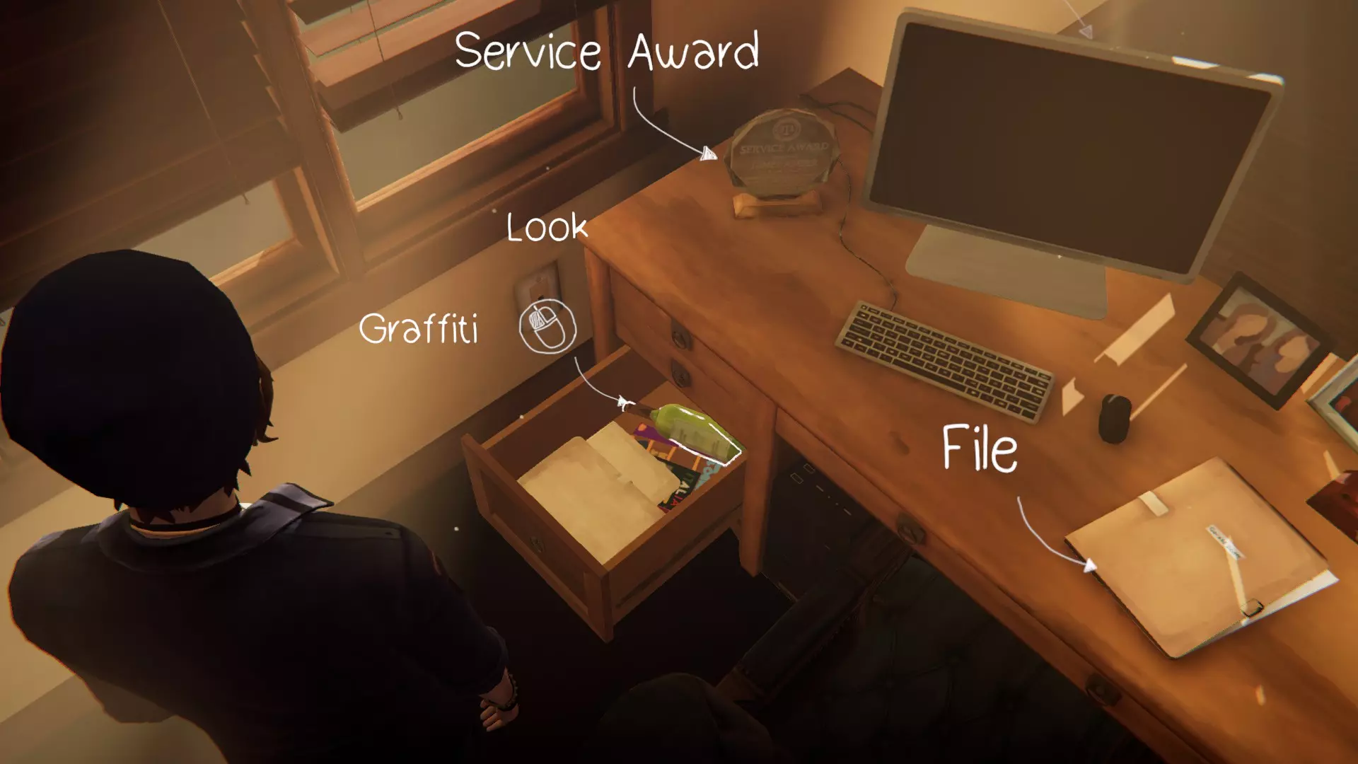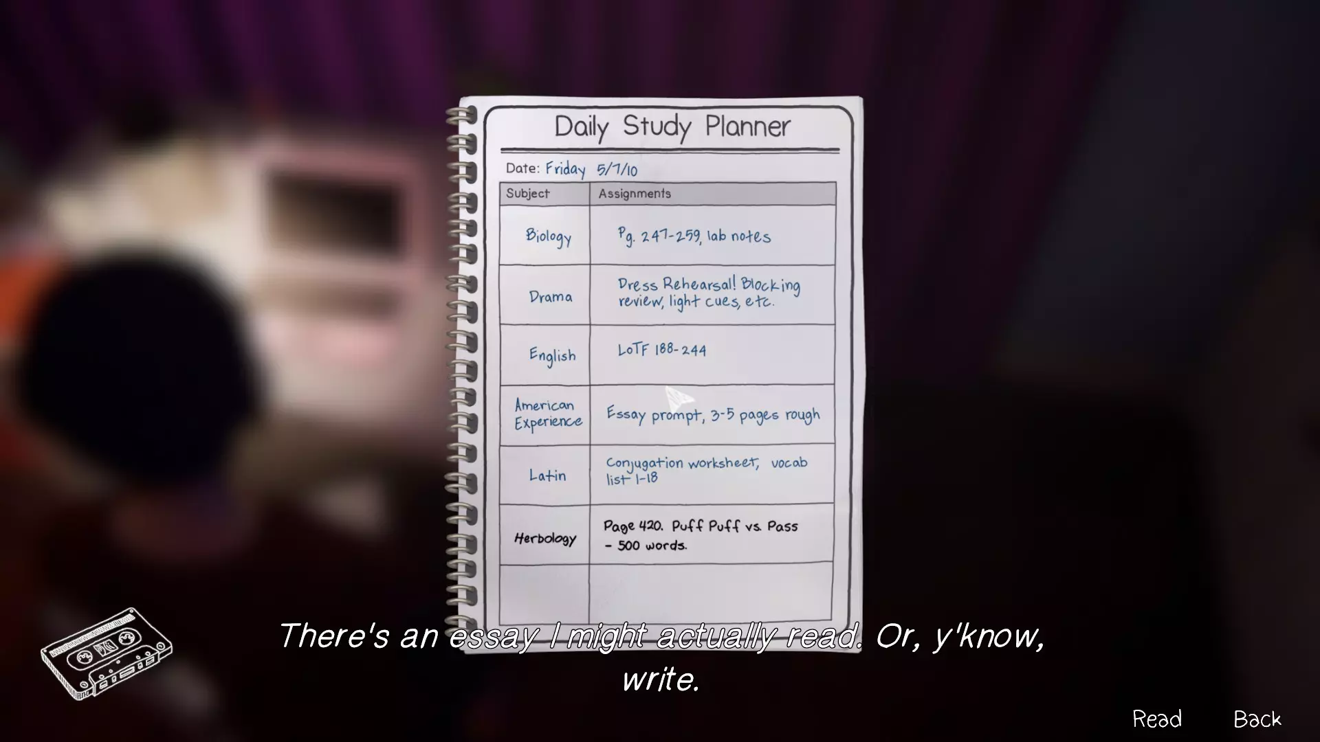 完成章节流程。获得章节通关成就。 第三章:万念俱灰。 1. 瑞秋的房间。[2/2] 第一个涂鸦地点在瑞秋的桌子上。 在日记本上写笔记。获得成就。