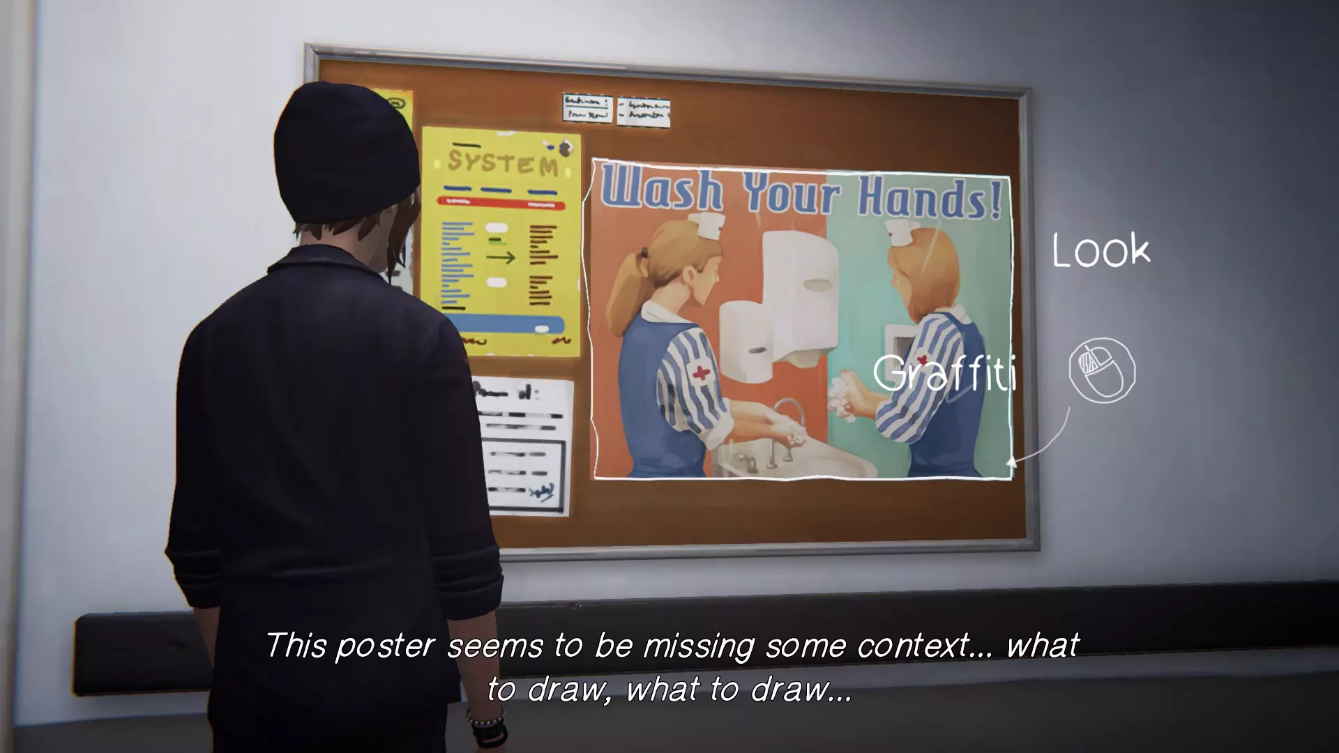 6. 学校戏剧实验室。[1/1] 第六处涂鸦地点位于与瑞秋共处的房间内。房间里挂着内森和瑞秋的海报。查看海报,绘制涂鸦。