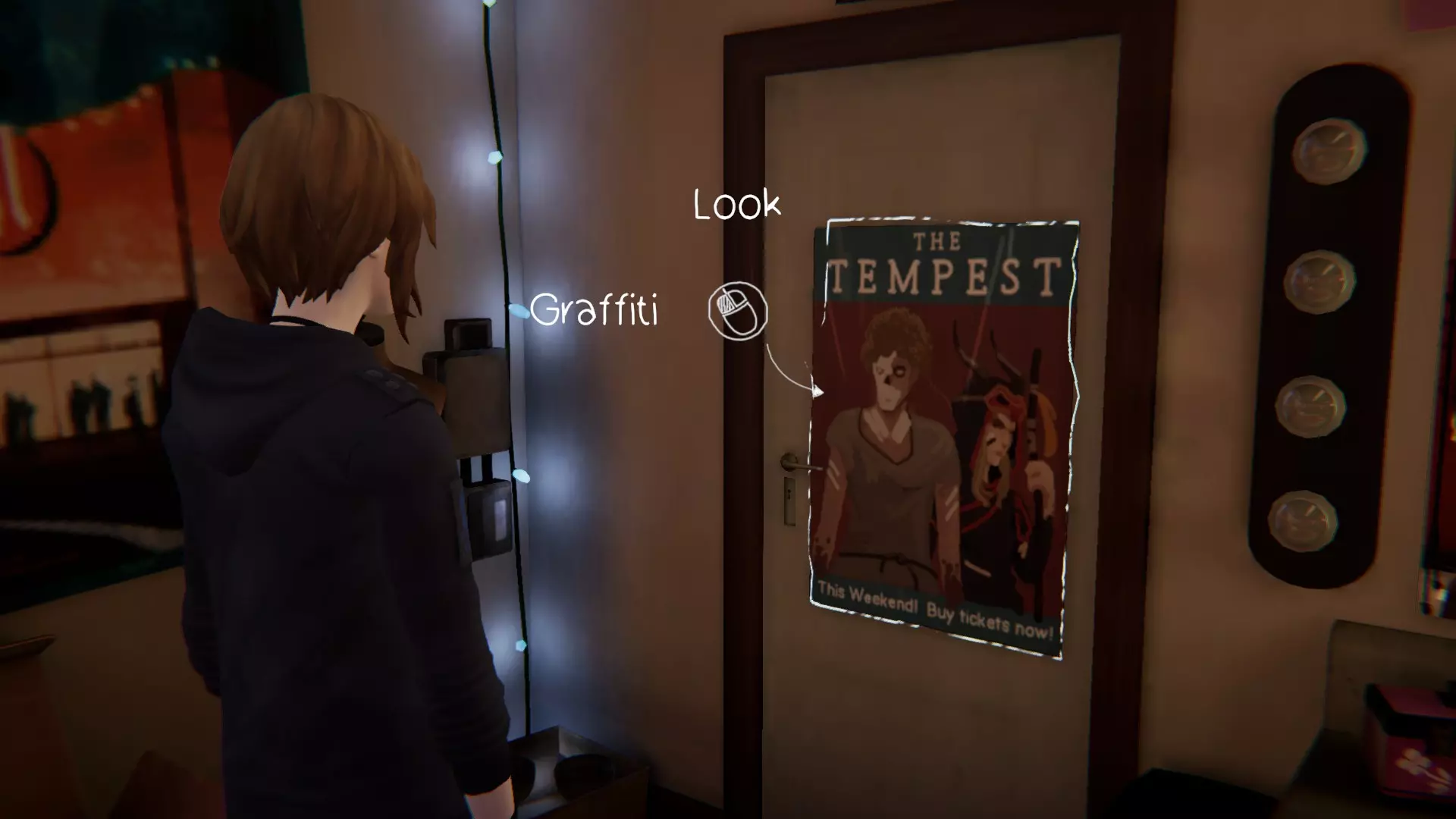 10. 梦想。[1/1] 第十处涂鸦位置在《暴风雨》海报后面。 查看海报,但我们没有马克笔,所以在瓶子里找到它,拿起并绘制下一处涂鸦。