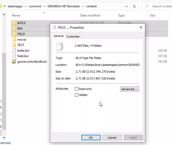 需要删除哪些文件 若要移除过滤功能,你需要对游戏文件进行操作。 我的游戏文件位于以下路径: S: SteamLibrary steamapps common GRANDIA HD Remaster 删除content文件夹下BATLE文件夹内的所有.tpk文件(共5个) 删除content文件夹下BIN文件夹内的pgmdt_pgmdt__spriteinfo.bin文件(共1个) 删除content文件夹下FIELD文件夹内的所有spriteinfo.bin文件(共1434个) 如果你出于某些特殊原因想要恢复更改,只需在Steam库中右键点击该游戏,然后选择【验证游戏文件的完整性】即可重新下载缺失的文件。 完成此操作后,你的BATLE、BIN和FIELD文件夹应包含2665个文件。