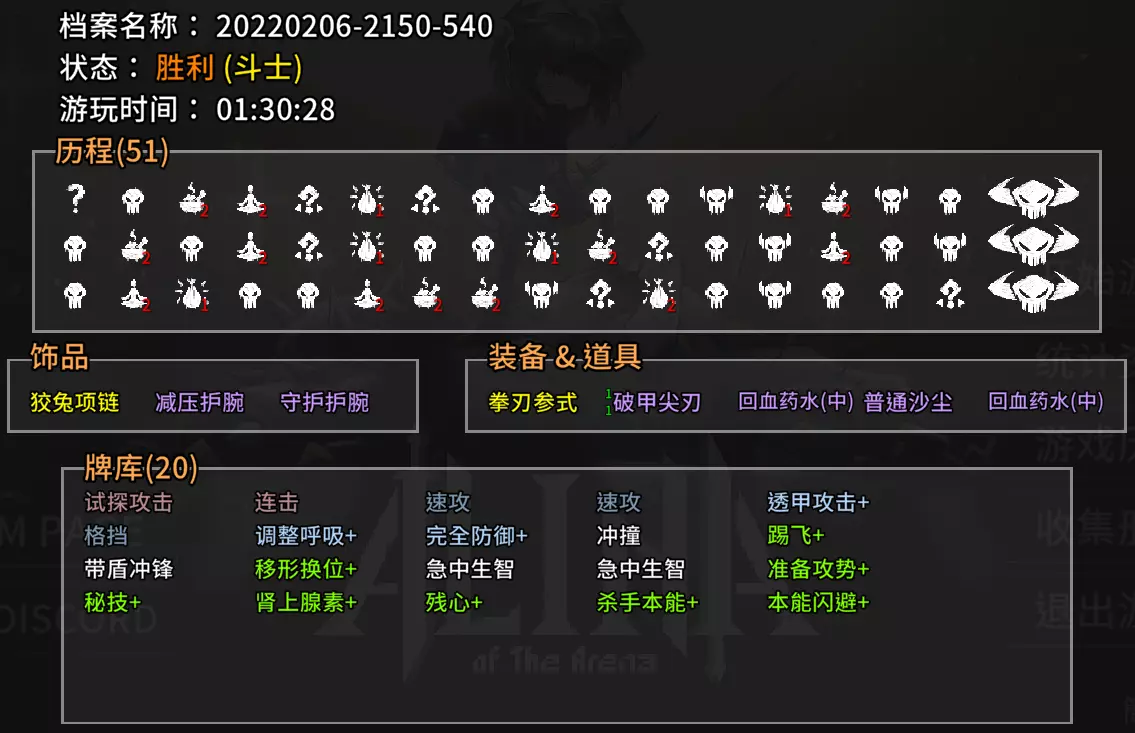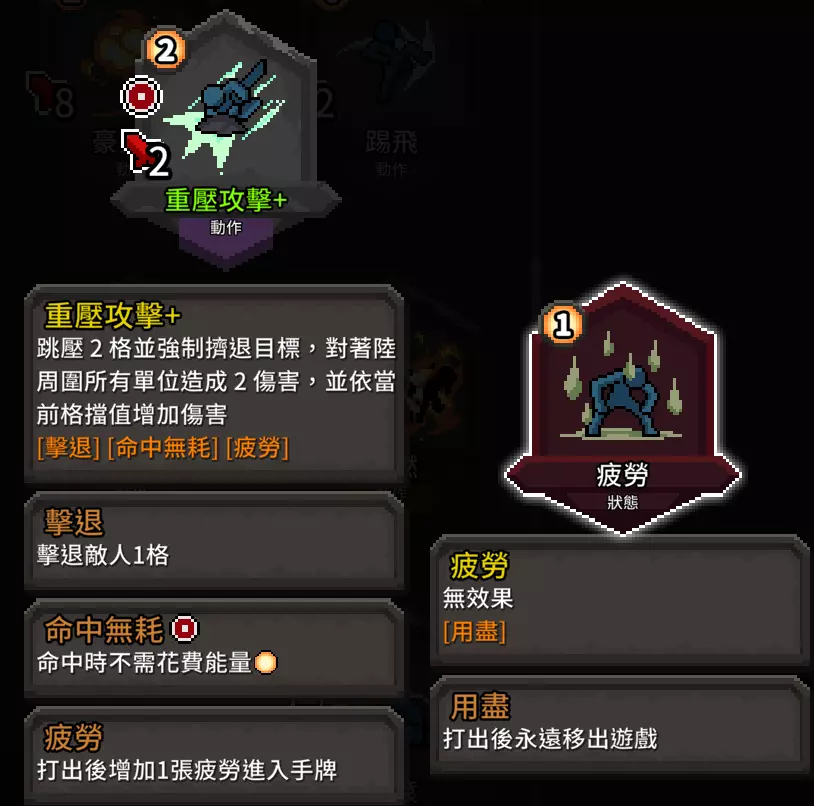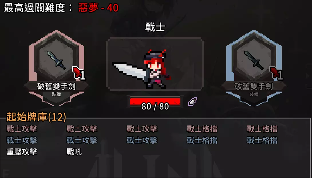 流派重点须知 本流派有几个重点需要遵守,才能发挥最大效益 A. 牌组要走极简风格,拒绝拿取一切不重要的牌,力求删除所有普攻普防牌(先删防,再删攻) B.【闪避追击】和【重压攻击】是这套牌组的灵魂,在商店或冥想中没找到请重开游戏读档 C. 技能牌也要少拿,至少不能影响到攻击与动作牌的流转 D. 本牌组不适合不太熟悉位移技巧及闪避追击效果的新手使用,属于老手可以玩得很开心,新手玩得不知所措的类型 E. 使用本牌组请放弃一切护盾牌,它们的存在只会卡手 流派角色选择:战士