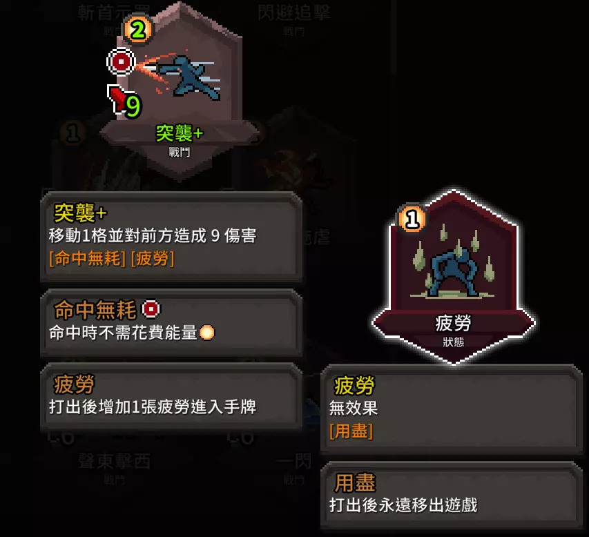 这张牌是唯一一张兼具位移、范围攻击和命中无消耗的卡牌。请确保手牌中至少有一张升级后的该卡牌。在T2阶段看到时可以考虑选择。