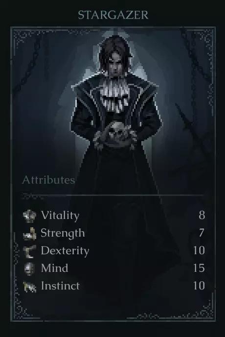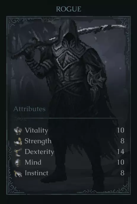 活力:12 力量:14 敏捷:9 心智:8 直觉:7 评价:对于打造力量型武器和拥有最佳初始活力来说,这是很棒的初始属性。当前游戏版本偏爱这个职业,且它与游戏内埃里克的角色立绘最为相似。 ~~~潜行者~~~