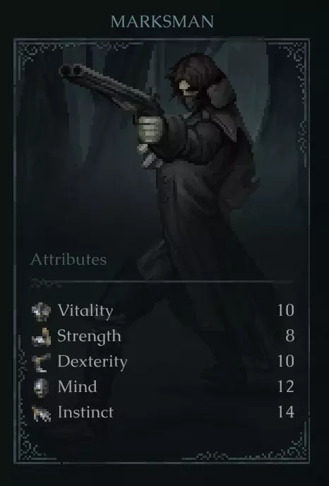活力:8 力量:7 敏捷:10 心智:15 直觉:10 评价:可以说是最出色的纯魔法使用者。由于你很可能在很长一段时间内使用不随心智属性加成的武器,或者使用心智并非主要属性的武器,因此【潜行者】或【格斗家】在近战法师方面表现更优,因为它们的直觉属性较低。这一点仅对极致追求属性配点的玩家有意义。不过,魔法伤害和专注值的即时提升使该职业还算不错,但恢复专注值要么会花费金钱,要么需要时间寻找可招架的敌人。偏向心智的build在游戏中期才能真正发挥作用,这使得该职业成为初始挑战较高的职业之一。初期魔法效果不是很显著,但在游戏中期和后期,魔法是游戏中最致命的能力。同样地,高心智属性能让你获得专注值以使用武器技能,这些技能同样极具杀伤力。部分魔法需要消耗本能值,因此该职业非常适合以魔法为核心的玩法。此外,该职业的形象与游戏中埃里克的 sprite 形象差异最大。 神射手