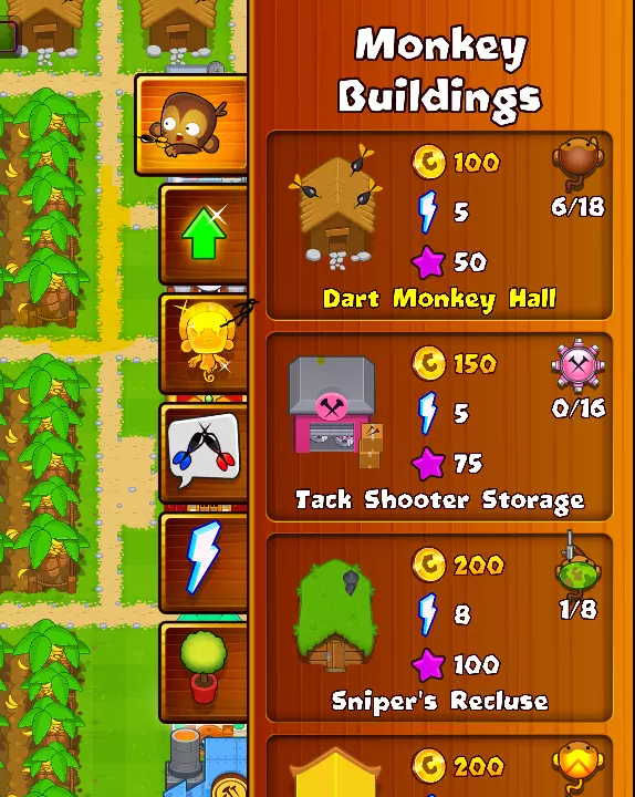 在游戏中打开建造菜单,需点击底部带有锤子和锯子的按钮。若操作成功,屏幕右侧会出现一个菜单,显示多个标签页和建筑。放置飞镖猴小屋