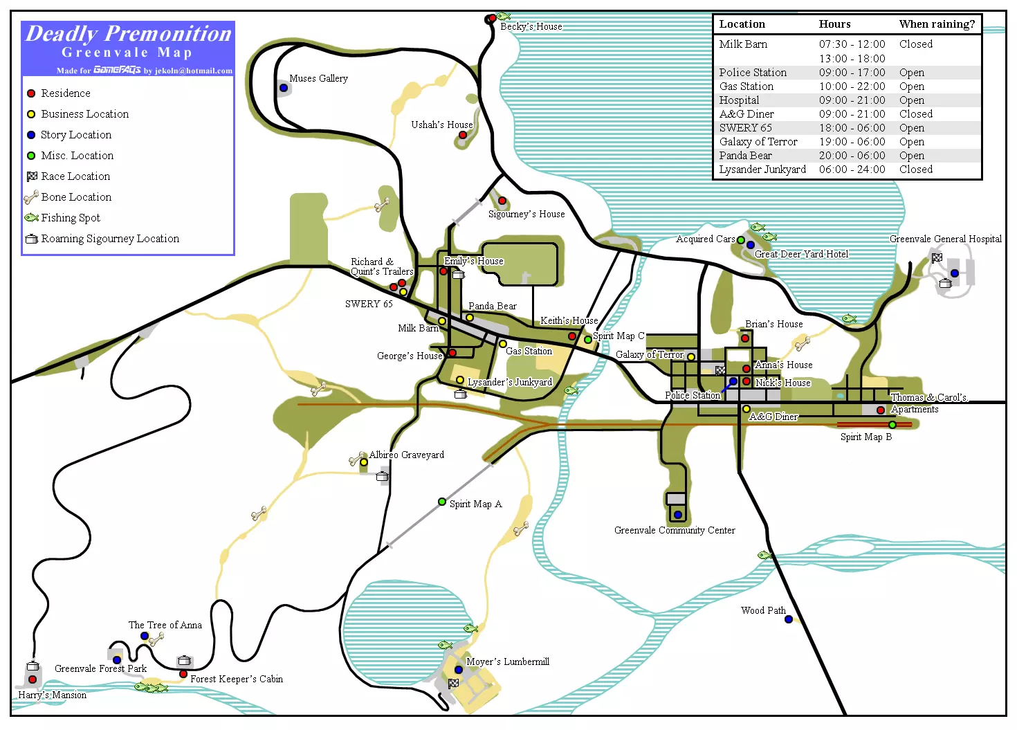 格林维尔的建筑 A & G餐厅:由尼克·科马克经营,是游戏中主要的用餐地点。这里也是约克与其他游戏角色的常见会面场所。 阿尔比雷奥墓地:由失眠症患者布莱恩负责管理,墓地里有几棵看起来颇为诡异的红树。 恐怖星系酒吧:由卡罗尔·麦克莱恩经营的酒吧,在镇民会议后开放。卡罗尔经常在酒吧里唱歌,托马斯则常在此担任调酒师。 巨鹿院酒店:一家规模过大的酒店,是约克在游戏中的主要休息场所。由波莉·牛津经营,她几乎总能在前台后被找到。凯森在镇上时会住在这家酒店,黛安有时也会在那里用餐。大鹿院酒店拥有多个房间,但似乎只有凯森和约克实际入住。每个房间几乎完全相同。酒店老板波莉住在一间大套房里,套房内有一个满是植物的房间和一间带四柱床的宽敞卧室。 格林维尔社区中心:内有墨丘利剧院和钟楼。它是格林维尔最古老的建筑之一。 格林维尔森林公园:第一起谋杀案的发生地。公园本身面积广阔,包含三个主要钓鱼点。由吉姆·格林负责照料。该公园在《致命预感:导演剪辑版》的开场过场动画中出现。 格林维尔综合医院:位于城镇边缘,是约克在游戏中最早访问的地方之一。这里也是唯一可以购买生命恢复道具的地方。格林维尔 sheriff 局:警察局是调查的中心集合点。由乔治·伍德曼负责管理。如果托马斯在警局,他还会提供餐食,这些餐食是游戏中效果最好的状态恢复道具之一。乔治·伍德曼有时会在自己的办公室里对着镜子展示肌肉、举铁。 天堂与地狱加油站:格林维尔唯一可以购买汽油的地方。由“狂暴公牛”杰克和他的妻子“玫瑰唇”吉娜共同拥有并经营。约克也可以在加油站洗车,还可以通过贿赂杰克获取不同支线任务的信息。 莱桑德的垃圾场:由莱桑德将军拥有的废料场。约克可以找到零件来让他的车跑得更快,或者购买新车,包括莱桑德修好后的他自己的车。 牛奶谷仓:由基思和他的妻子莉莉·英格拉姆经营的便利店。店里售卖各种物品,比如食物、弹药和钓鱼装备。基思还持有能获得武器升级的地图。这家店贴满了带有摇滚主题的海报。 莫耶锯木厂:第一起谋杀案的发生地。它是游戏中少数仅在特定章节可进入的地点之一。 缪斯画廊:由黛安·埃姆斯拥有的艺术画廊。画廊里几乎所有的画作都是树木的形象。 熊猫熊:一家位于枪械匠韦斯利家中的枪支商店。他所有的商品都可以通过镇上各处的工具箱在任何时间获取。SWERY '65:理查德·邓恩经营的酒吧。这家酒吧以飞镖盘闻名,你可以用飞镖枪玩飞镖来获取各种物品。 住宅区 安娜的家:下午12点后,当萨莉·格雷厄姆在家时,约克可以在安娜·格雷厄姆的房子周围闲逛。萨莉还会给他支线任务,这些任务会补充安娜在谋杀当晚所做事情的细节。 贝基的家:湖边的一座豪宅,贝基·艾姆斯的家是游戏前半段的焦点。 布莱恩的家:失眠者布莱恩的家位于小镇的老城区,周围围着带刺铁丝网(至少约克是这么说的,不过那明明是铁栅栏)。如果你有布莱恩家的钥匙,可以从大门右侧的小门进入。卡罗尔的家:卡罗尔·麦克莱恩的公寓要到游戏后期才能进入。她的公寓通过厨房与托马斯的公寓相连。 艾米丽的家:虽然开放时间很短,但艾米丽·怀亚特在雨天晚上结束警局工作后,会向约克提供支线任务。有时你会看到她在镜子前练习自卫动作。 乔治的家:位于垃圾场附近,直到游戏结束才能完全进入。 哈里的豪宅:格林维尔最大的房子,在游戏后半段可以随时进入。尽管房子很大,但只有哈里·斯图尔特和迈克尔·蒂洛森住在那里。 森林看守人的小屋:位于格林维尔森林公园边缘的小屋,是吉姆·格林的家。基思的家:英格拉姆一家的住所。下雨天,他们会坐在沙发上,莉莉给双胞胎艾萨克和以赛亚读书,基思则沉浸在音乐中。 尼克的家:尼克和奥利维亚·科马克的家。通常只有奥利维亚在家,她总是在客厅里来回踱步。 昆特的家(开放时间16:00-18:00):位于SWERY '65后方的拖车之一,由昆特·邓恩居住。里面堆满了自行车油箱,墙上贴满了彩色海报。 理查德的家:SWERY 65'后方的另一辆拖车,由理查德·邓恩居住。比昆特的拖车整洁得多。 西格妮的家:在“冷锅”支线任务中,约克需要开车将“漫游”的西格妮送回她家。你可以在车道上找到西格妮的另一只鞋。托马斯的家:托马斯·麦克莱恩的公寓要到游戏后期才能进入。当你透过窗户看时,有时能看到托马斯随着休闲音乐跳舞。 异世界 在游戏的不同阶段,约克必须前往异世界收集线索并分析该区域。这些地方都会变成现实世界景象的破败腐朽版本。阴影在走廊中游荡,并在随机位置出现。这里也是约克与雨衣杀手互动的地方。 根据情况不同,建筑布局也可能发生变化。完成最初的异世界场景后,约克可以返回该地点并再次体验。重玩可能会获得最初无法获得的物品、交易卡牌和武器。这些区域包括: 莫耶锯木厂 贝基的家 缪斯画廊 格林维尔综合医院 格林维尔警局 恐怖银河 哈里的宅邸 格林维尔社区中心(水星剧院) 天津四墓园 另外三个地点——科普隧道、延伸线路公司以及达利斯公司格林维尔变电站——提供基于基思地图的异世界挑战,完成后可获得各种无限武器。 凌晨00:00(午夜)至06:00期间,外部世界会转变为异世界。阴影会持续生成,野狗会变成巨型怪物。此时间段出现的阴影更有可能掉落物品,但也更擅长偷袭并杀死