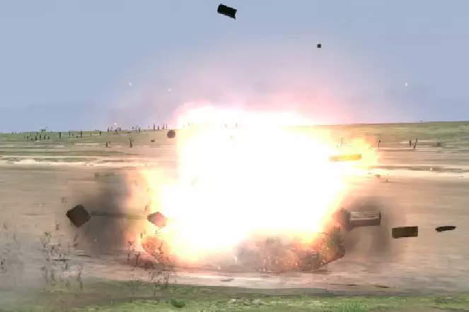 毁灭性击杀(2)命中后弹药架/发动机/油箱起火燃烧,乘员在爆炸前弃车逃生。