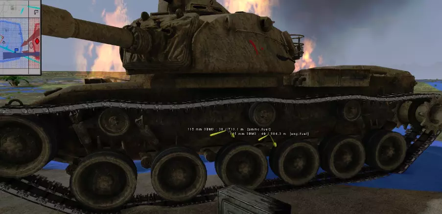 炮弹 APFSDS/APDS:由于具有高初速,是精准摧毁坦克的首选炮弹,但在引发燃烧/爆炸方面不如破甲弹(HEAT)。T-62坦克优先使用APFSDS,因其高初速。 HEAT-FS:用于引爆弹药的选择,也是M60坦克的首选炮弹。M60的破甲弹具有不错的初速和穿透力。 HE/HESH:反步兵炮弹,但也可用于对付坦克。你可以向坦克的顶部装甲或驾驶员位置上方发射高爆弹(HE),这样能杀伤其下方的人员。高爆弹(HE)能有效降低敌方士气,若运气好击中装甲薄弱部位,还有可能引爆弹药架。