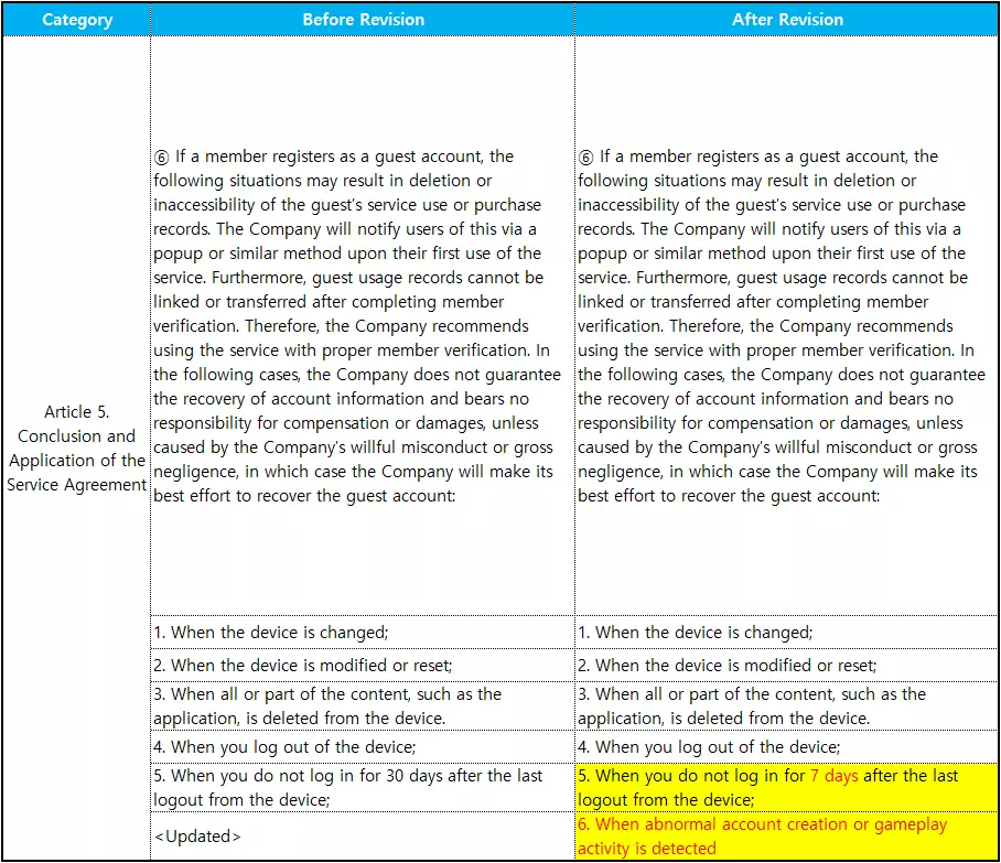 《StarSavior》服务条款更新公告 各位舰长,您好!我是联络官GM Lisa。 《StarSavior》服务条款将于2026年4月30日进行更新,现将相关变更内容提前通知如下: 一、修订原因 - 调整游客账号长期不活跃政策 二、修订章节 - 第5条:服务协议的终止与适用,第6款 三、生效日期 - 2026年4月6日 ※若您在修订政策生效日期后继续使用本服务,将视为您同意更新后的政策,届时修订后的政策将正式生效。 四、变更内容概要 - 新增关于长期不活跃游客账号登出及数据删除的指引