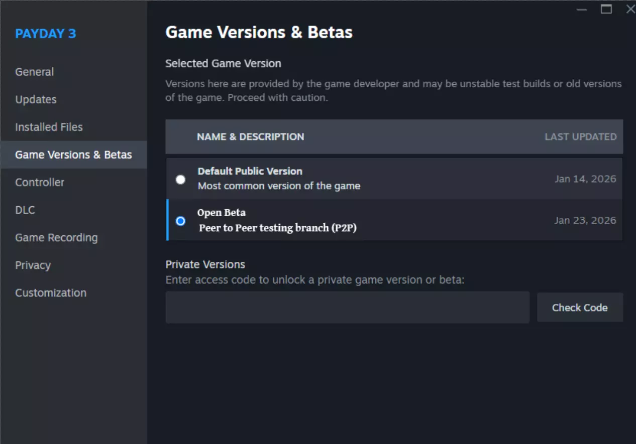 各位劫匪们! 我们将于周四至周一开启Steam测试,以测试一些全新的P2P匹配底层改进! 欢迎加入Steam上的公开测试分支! 如何参与测试: 测试将在Steam的独立分支上进行。要切换分支,请在Steam库中右键点击《收获日3》,然后选择“属性”。