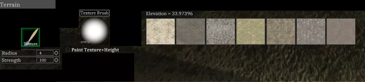 纹理绘制 现在你可以根据自己的喜好调整地形高度了,接下来需要了解如何更改地形本身的纹理。首先在地形选项卡中选择【纹理】工具。选中该工具后,在【地形】选项卡中间位置选择一种地形纹理。选好【纹理】工具和想要使用的纹理后,用鼠标左键在地形上绘制新纹理。你可以像之前调整【高度笔刷】那样调整【纹理笔刷】。最常见的用法是在较大区域的纹理混合中添加噪点效果。