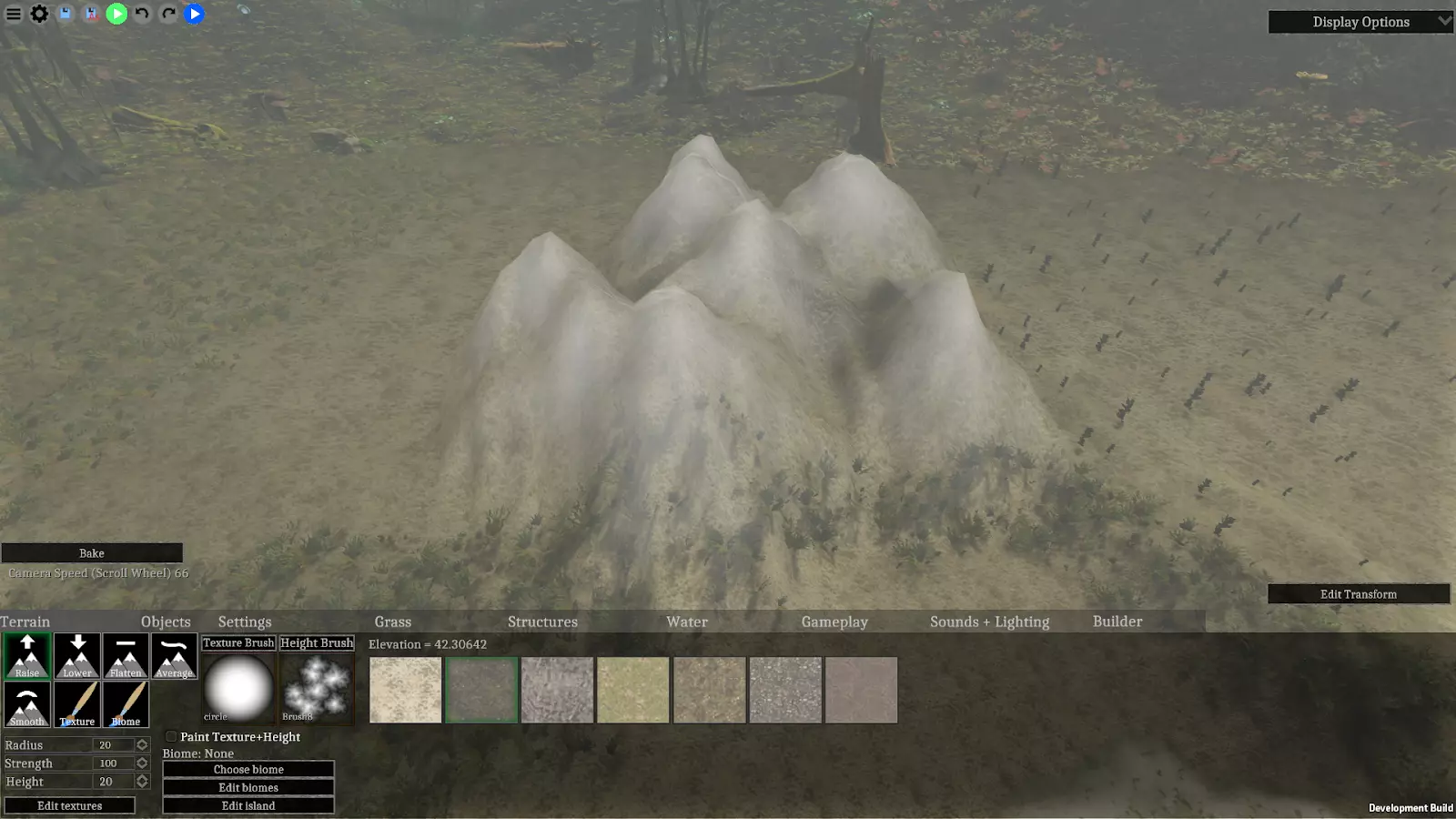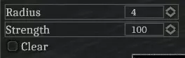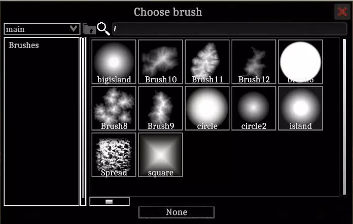 这些工具的功能类似于绘制声音区域。使用鼠标左键可将功能应用到高度笔刷范围内的地形。 工具 抬高 - 增加地形高度。 降低 - 降低地形高度。 平整 - 使笔刷范围内的地形与中心高度一致。 平均 - 获取笔刷范围内地形高度值的平均值,并将其应用到笔刷区域。 平滑 - 消除地形的锐利边缘,使其更加圆润。 设置 半径 - 高度笔刷的大小,与所有地形功能相关。 高度 - 笔刷纹理最亮部分应用于地形笔刷的最大高度。此设置仅与“抬高”和“降低”功能相关。强度 - 每个地形功能的强度,且与所有地形功能相关。可将其视为0到1之间的乘数。 点击【高度笔刷】按钮可以更改笔刷的纹理。根据所使用的笔刷纹理和地形工具,绘制时会产生各种不同的效果。