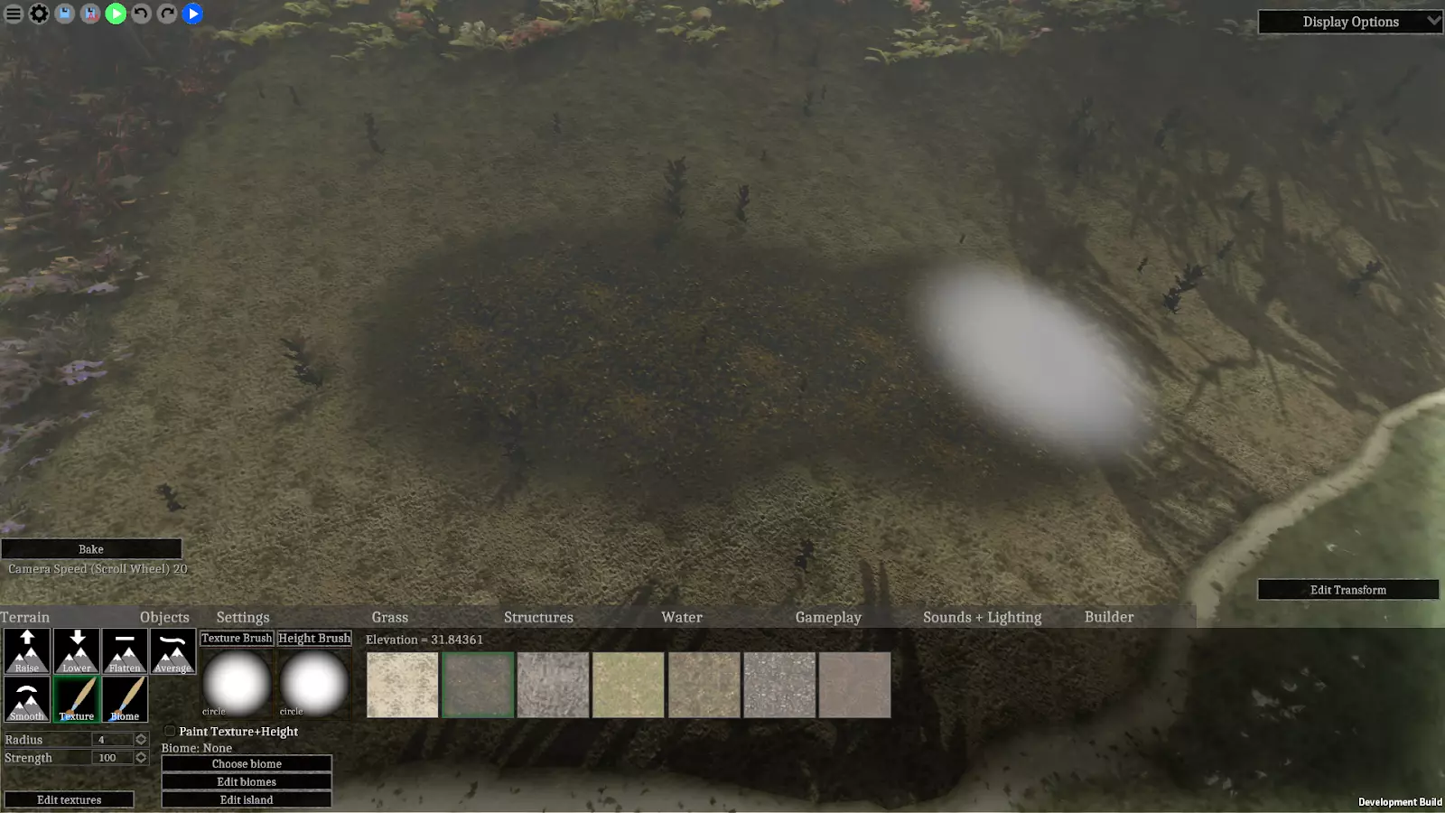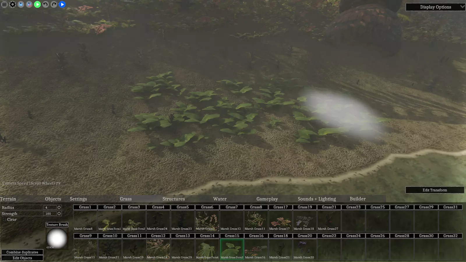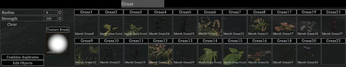 每个关卡最多可拥有32种不同的草丛。【草丛】标签页的大部分空间用于分配和显示这些草丛类型。你可以点击缩略图上方的按钮,为槽位分配新的草丛。 点击草丛槽位的缩略图后,你可以使用鼠标左键在地形上绘制所选草丛。【半径】和【纹理画笔】设置的作用与地形工具类似,但【强度】设置在草丛功能中有所不同,它用于控制生成草丛的密度。“力量”设置下方有一个标有“清除”的复选框,用于移除草丛。