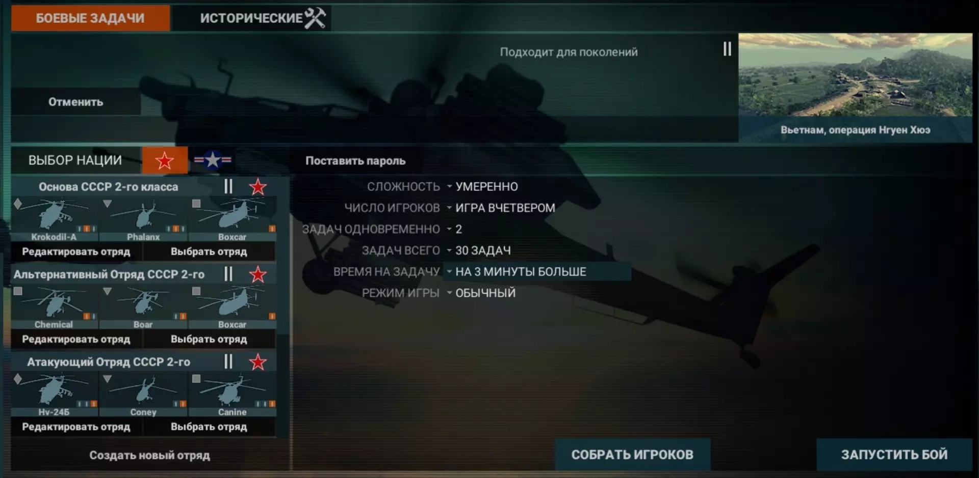 重要提示:只选择苏联阵营,因为依靠美国阵营升级是不可行的,其缺乏像米-8和米-4那样数量的火箭弹! 创建连队时请执行以下操作: