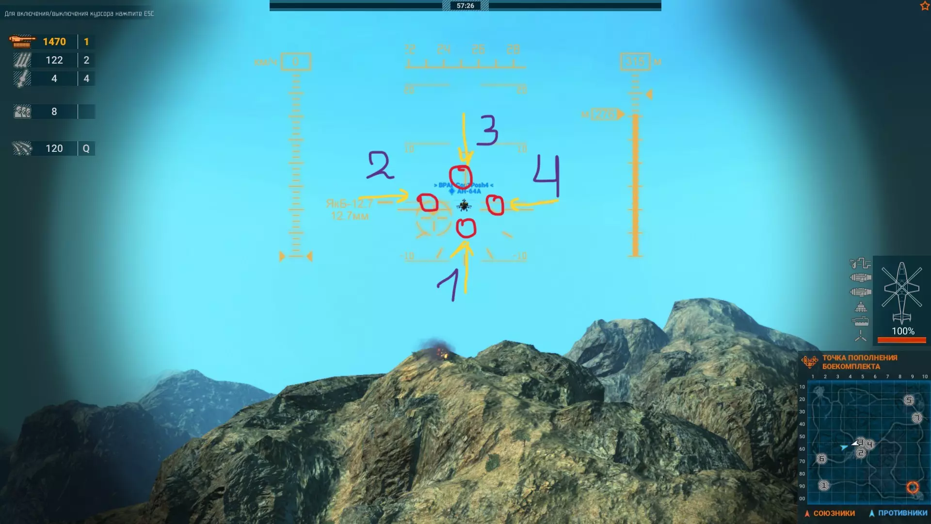在这张截图中,我用圆圈标出了警告区域。当目标在战斗中左右转向时(分别对应数字4和2),或者试图通过爬升或下降来逃离我们时(分别对应数字3和1),应该将准星对准这些区域。