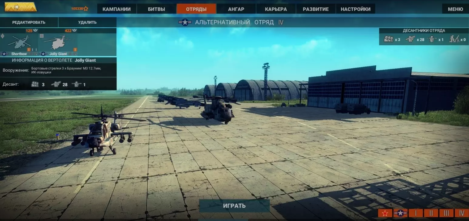 到了第四代还是老样子,所以操作也一样。但要记住!在没摧毁截图中显示的布莱德利步兵战车(Bradley)之前,不要试图去攻击那些体型较小的坦克。 第二部分:编队。空战。直升机的武器装备 1. 编队 我在游戏里玩了一年多,从2023年2月开始,所以可以肯定地说,空战本身的设定就不是为了长时间交火。 在PVP中你们会遇到什么样的情况呢?哪个小队更适合选择?又该挑选何种武器装备?当你被反坦克导弹击中后,你会立即换一架新的直升机,结果却又被击落! 首先,在与其他玩家交战之前,需要创建一个小队!这个小队将是后续战斗中最宝贵的战力。创建小队的过程其实很简单。但是,组建一支能够在后续PVP对战中,既应对地图上敌人的行动,又配合队友行动的精明队伍,会给新手或决定回归游戏的玩家带来困难。 这时候我就来帮忙了。 第一种:经典型。其中将包含所有类型的直升机,确切地说:攻击型、运输型和侦察型。其设计思路如下:它具有通用性。即使你的攻击型直升机被击落,你总能再选择两架准备起飞的直升机,它们的冷却时间不像攻击型直升机那么长! 给攻击型直升机配备最好的武器(按点数计算最昂贵的那种),侦察机则搭载火箭弹或机枪吊舱(如果有的话),运输机则根据自身情况搭载至少4人以上的步兵、火箭筒或便携式防空导弹! 运输型直升机不需要配备太昂贵的武器。它的主要任务是占领据点,并将弹药箱运送到指定地点(或地图的某个区域),以便在攻击直升机弹药耗尽时能够补充弹药。
