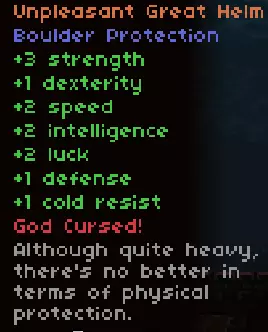 关于神之诅咒…… 【除非满足以下条件,否则不要进行神之诅咒:】 1) 你已获得束缚信徒之戒 (可通过向束缚神社投掷3张解咒卷轴获得) 2) 你的装备需具备以下附魔效果: 生命偷取 追踪箭矢 死亡保护 羽落 无限跳跃 武器攻击范围增加 伤害反射 *注:下图所示的颈部装备均为带有死亡保护的神之诅咒物品 :D