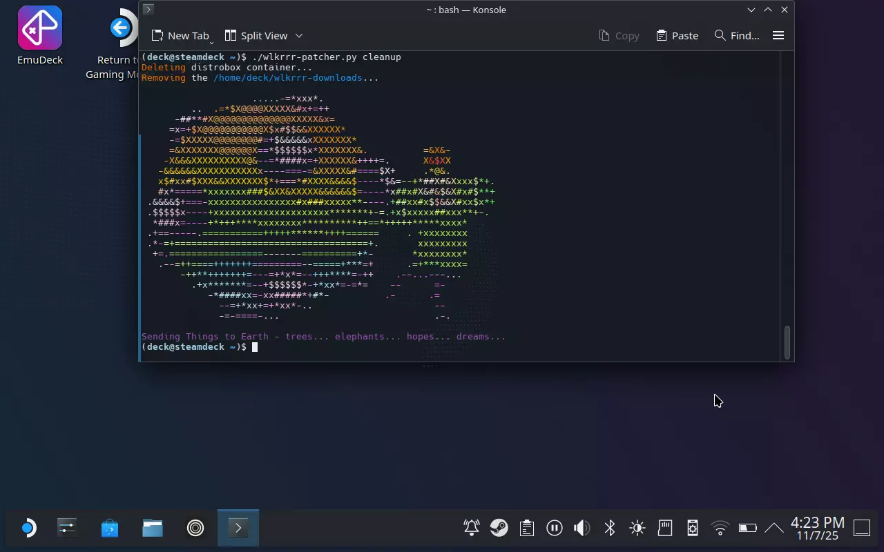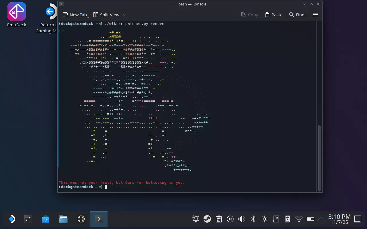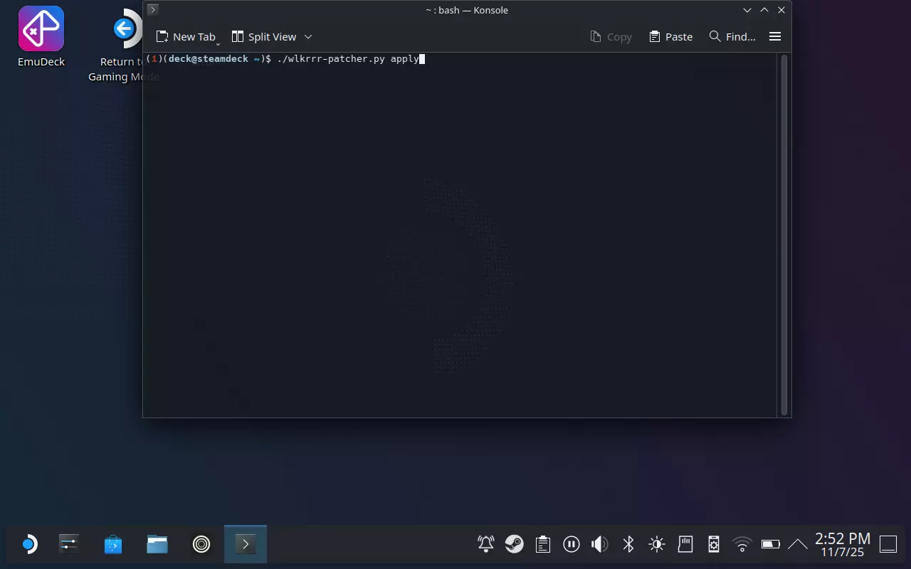 下载脚本 现在是比较麻烦的步骤:在终端中正确输入以下内容: 注意:提醒一下,使用远程SSH或KDE Connect能让这个过程轻松不少! 然后按“Enter”键。正确执行上述命令不会产生任何错误,并且会显示成功下载,类似如下信息: % Total % Received % Xferd Average Speed Time Time Time Current Dload Upload Total Spent Left Speed 100 95586 100 95586 0 0 195k 0 --:--:-- --:--:-- --:--:-- 195k 最后,输入以下内容并按“Enter”键: chmod +x ./wlkrrr-patcher.py 这会使脚本变为“可执行”状态。为了让宇宙大王开心,我们需要安装模组。在终端中输入以下内容并按下【Enter】键: ./wlkrrr-patcher.py apply 默认情况下将安装日文版。若要安装美版,请输入以下内容并按下【Enter】键: ./wlkrrr-patcher.py apply -l US