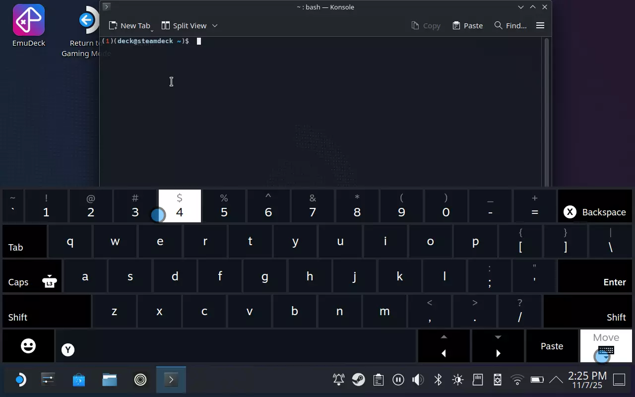 终端将会出现。在Steam Deck上按下【X】键以显示键盘。