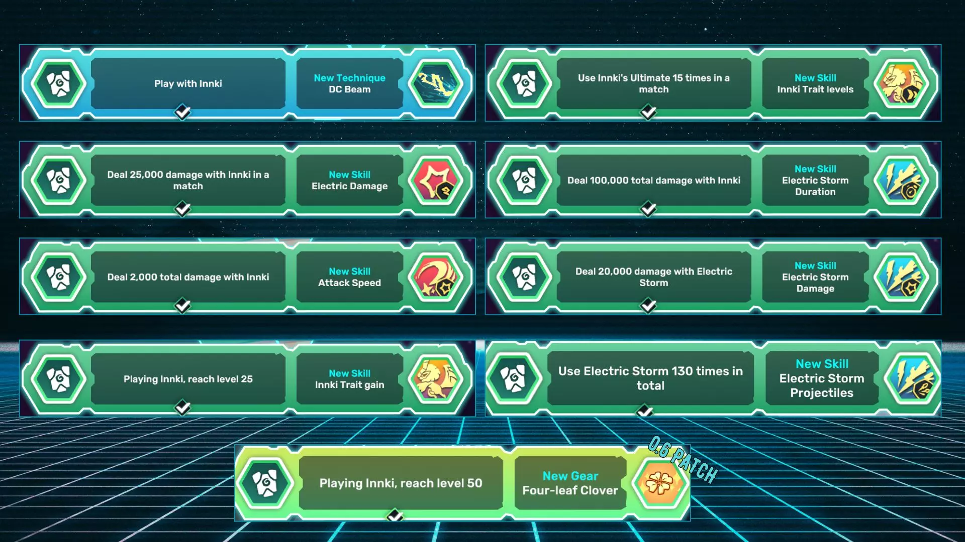 名称描述 DC光束 与因奇一同游玩。 电气伤害 在一场对战中使用因奇造成25,000点伤害。 因奇特性获取 使用因奇达到25级。 因奇特性等级 在一场对战中使用因奇的终极技能15次。 攻击速度 使用因奇造成总计2,000点伤害。 电气风暴伤害 使用电气风暴造成20,000点伤害。 电气风暴持续时间 使用因奇造成总计100,000点伤害。 电气风暴投射物 累计使用电气风暴130次。 四叶草 使用因奇达到50级。 鸭嘴兽