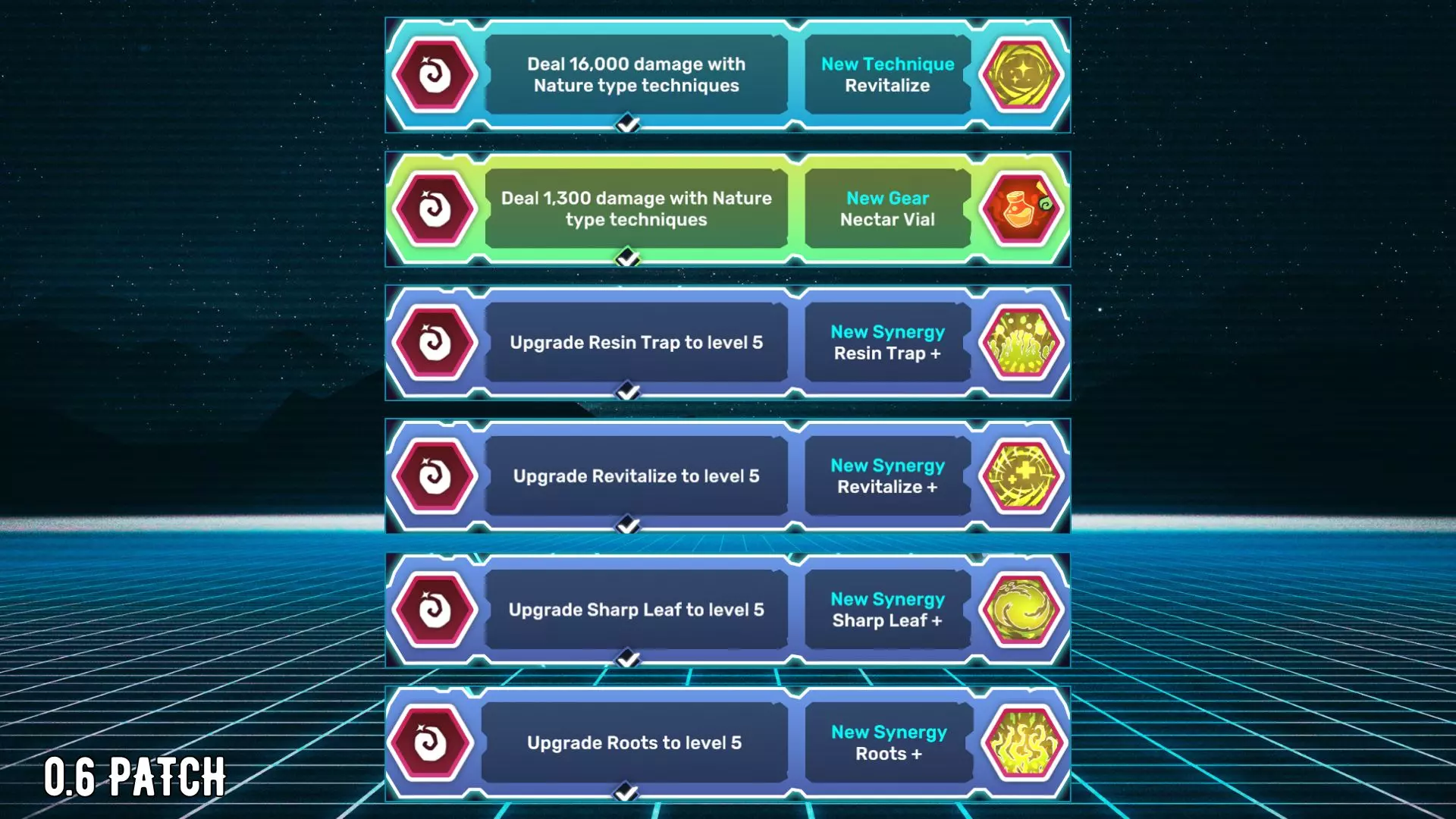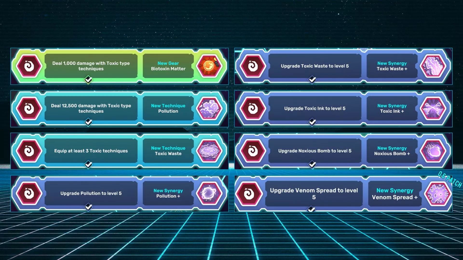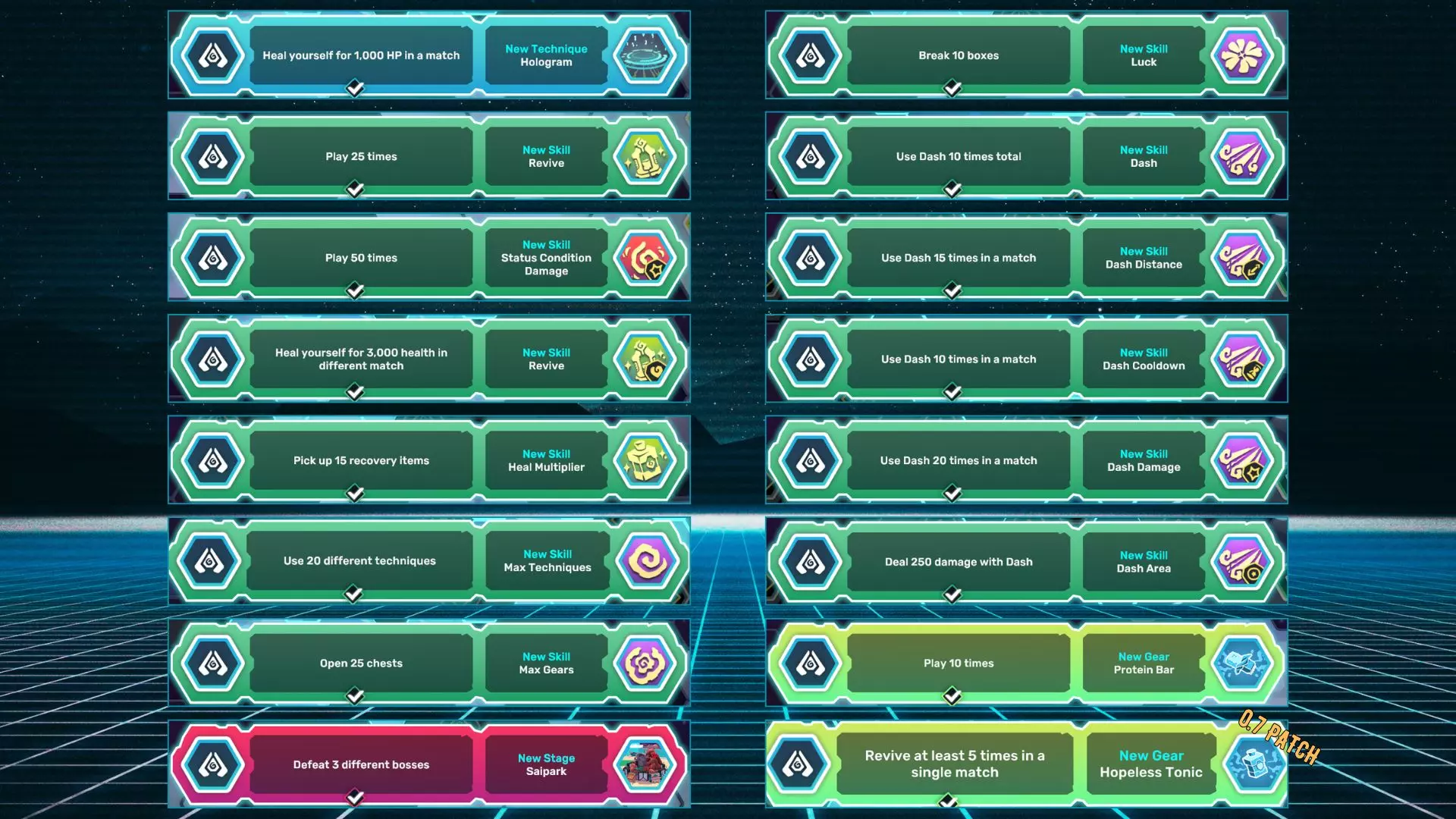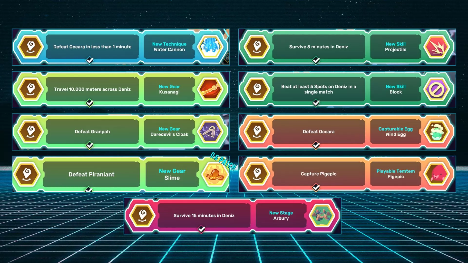 【Projectile】在德尼兹生存15分钟。 【Block】在单场比赛中至少击败德尼兹的5个据点。 【Kusanagi】在德尼兹旅行10,000米。 【Daredevil’s Cloak】击败格兰帕。 【Wind Egg】击败奥希拉。 【Pigepic】捕捉皮格皮克。 【Water Cannon】在1分钟内击败奥希拉。 【Arbury】在德尼兹生存15分钟。