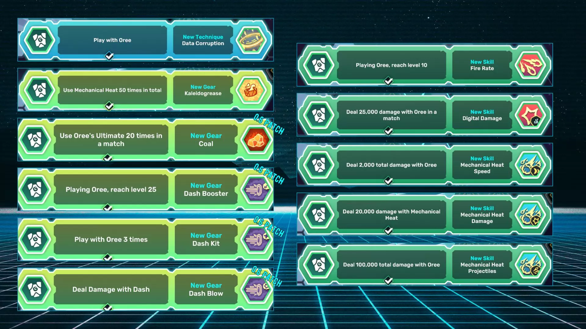 数据损坏:使用奥瑞进行游戏。 万花油:累计使用50次机械热能。 煤炭:在一场对战中使用20次奥瑞的终极技能。 冲刺助推器:使用奥瑞达到25级。 冲刺套件:使用奥瑞进行3次游戏。 数字伤害:在一场对战中使用奥瑞造成25000点伤害。 射速:使用奥瑞达到10级。 机械热能速度:使用奥瑞累计造成2000点伤害。 机械热能伤害:使用机械热能造成20000点伤害。 机械热能投射物:使用奥瑞累计造成100000点伤害。 Innki